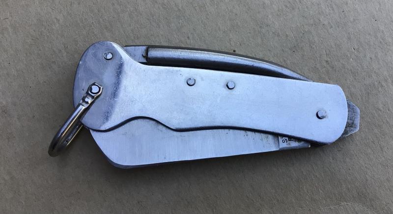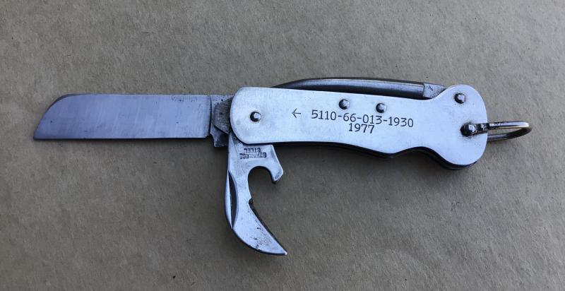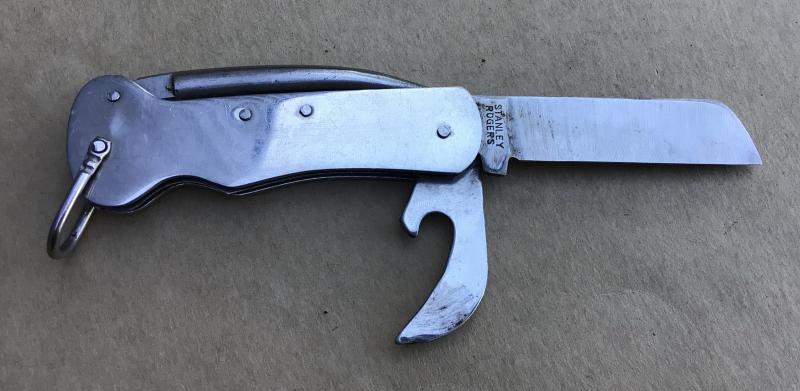 Three bladed knife by Stanley Rogers. Stainless steel blade, opener and marlin spike. NATO stock number for Australia and dated 1977. VGC