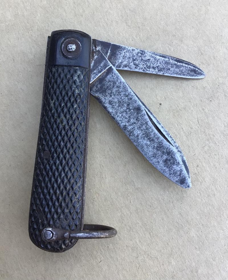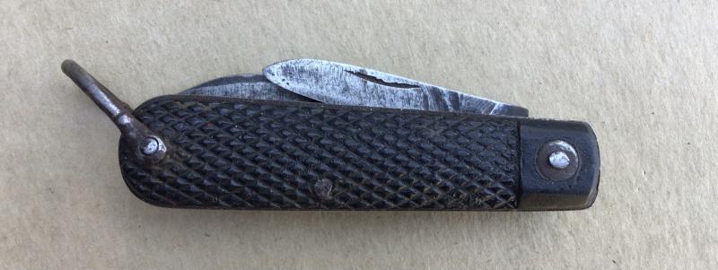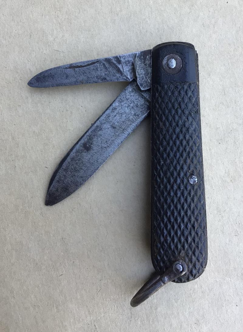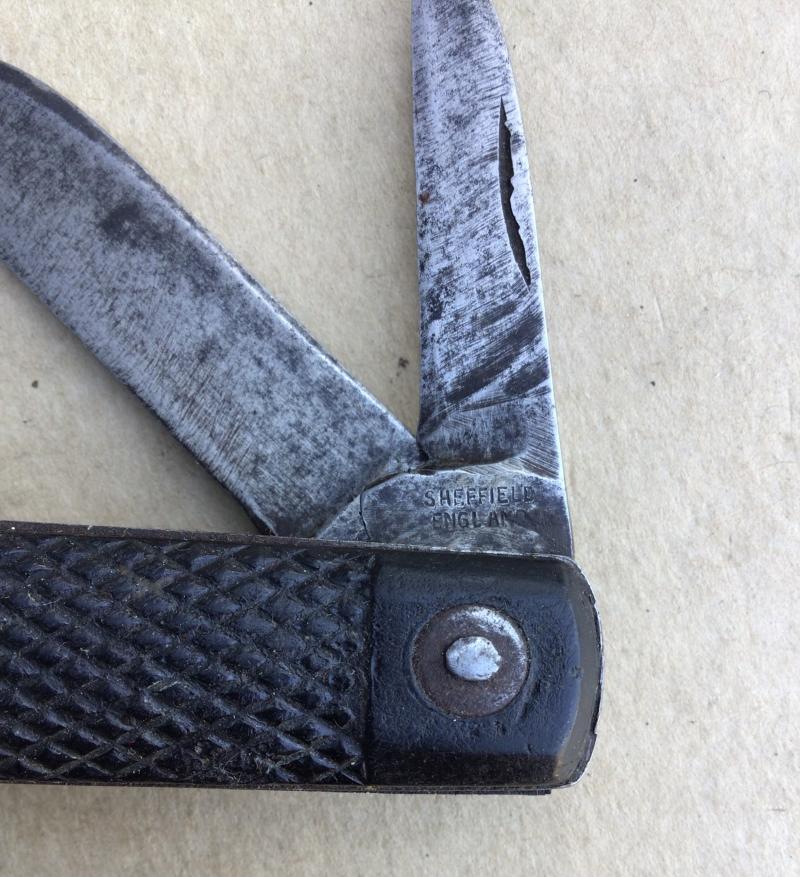 Two blade knife. The blade marked “Sheffield England”. Black Bakelite grips and steel shackle. Worn condition.