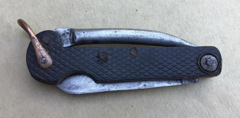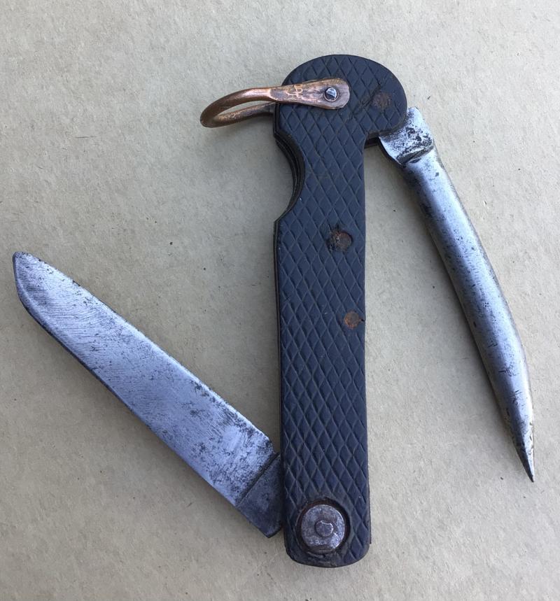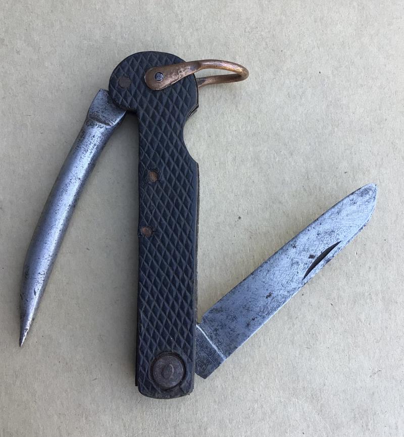 Easy Opener 2 blade. Commercial pattern c.1920’s. By J McCory Sheffield. Single blade, marlin spike and copper shackle. Worn condition.