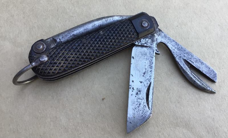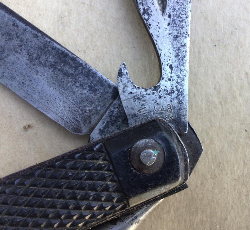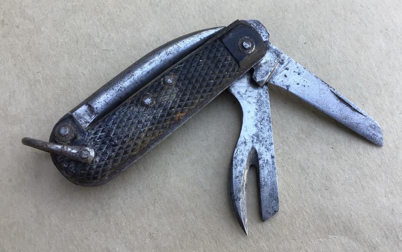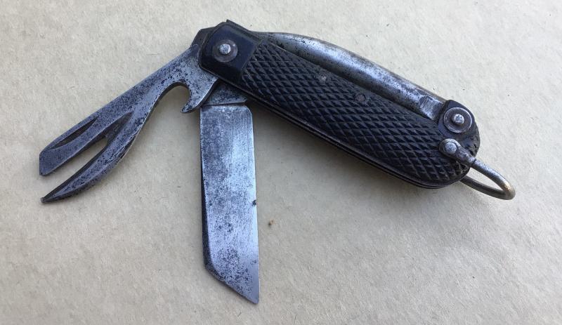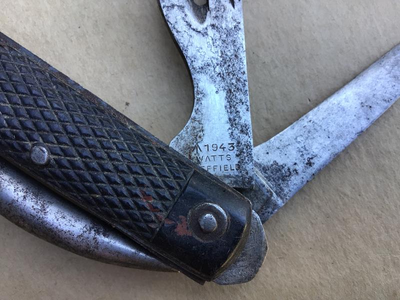 Three bladed knife by Watts Sheffield and dated 1943. A very well worn sheepfoot blade, crab claw opener and mark in spike. Black Bakelite grips and steel shackle. Worn condition.