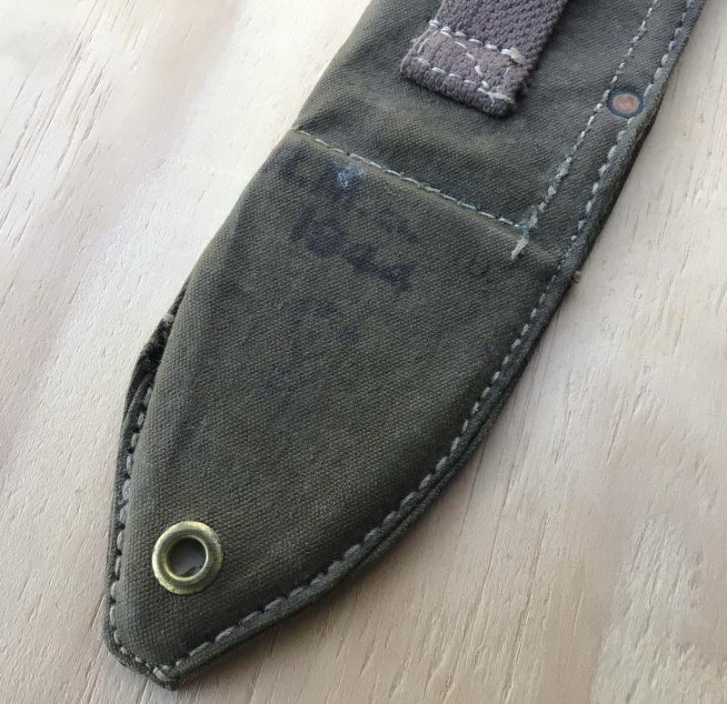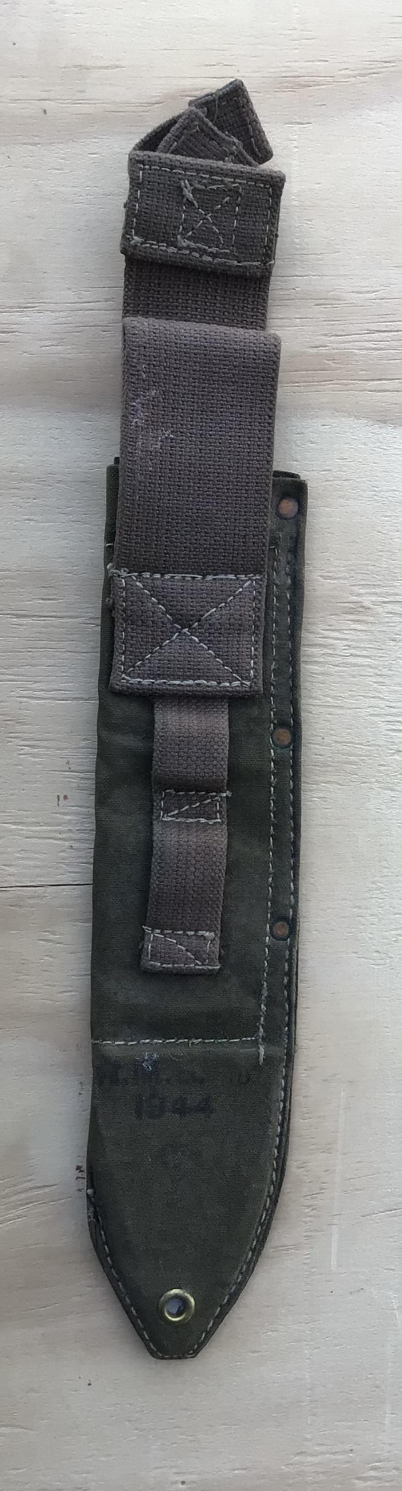 Green canvas and webbing with copper rivets and steel spring mouthpiece. Dated 1944.