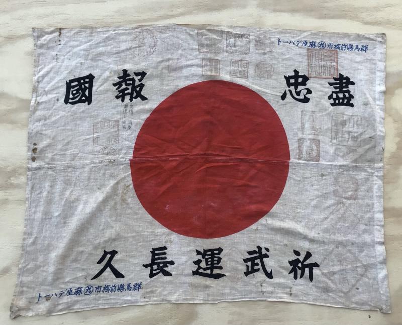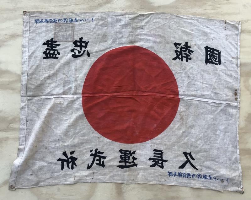 Screen printed cotton. Approx 680mm x 880mm. The characters translating to “ We serve out country with loyalty. We pray for your luck in chivalry and longevity. Light soiling overall.