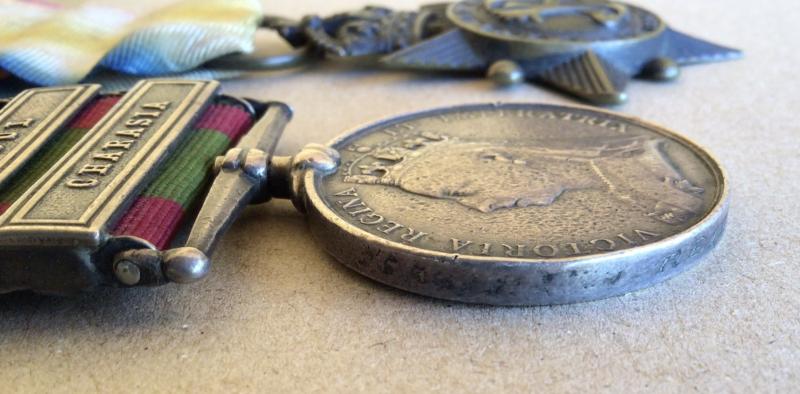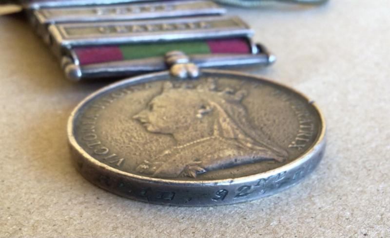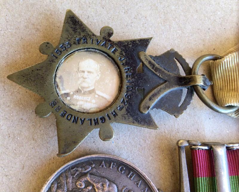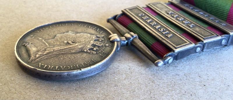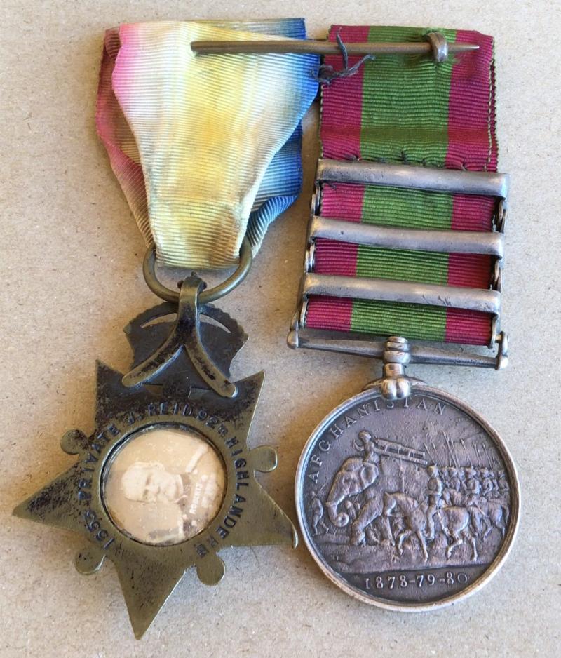 Afghanistan Medal , 3 clasps “Charasia, Kabul, Kandahar”. Engraved in large Roman capitals ( 1553 ….REID 92nd High…) well worn and hard to read. Heavy wear and many contact marks with particular to the obverse. Kabul to Khandaha Star, the reverse impressed “1553 PRIVATE J REID 92nd HIGHLANDERS”. The center Reverse with an image of Lord Robert’s. Mounted as worn.