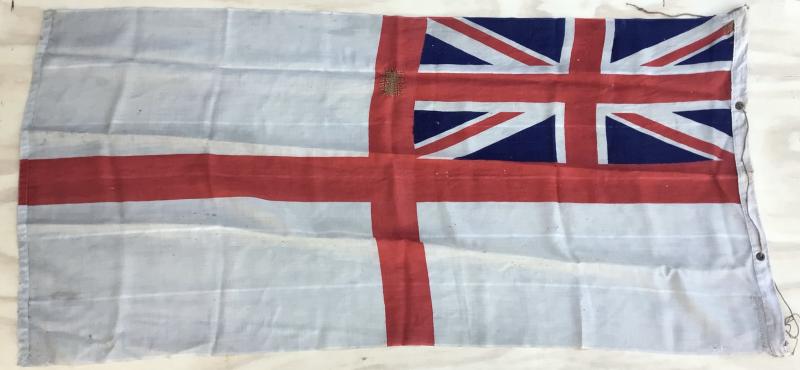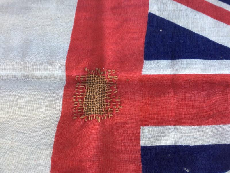 Double sided screen printed wool. Broad arrow acceptance ink stamp on the halyard. Hemp rope halyard toes. Period “field” repair to the center with a heavy coarse wool. Wartime example approximately 870x 1750mm
