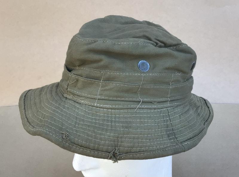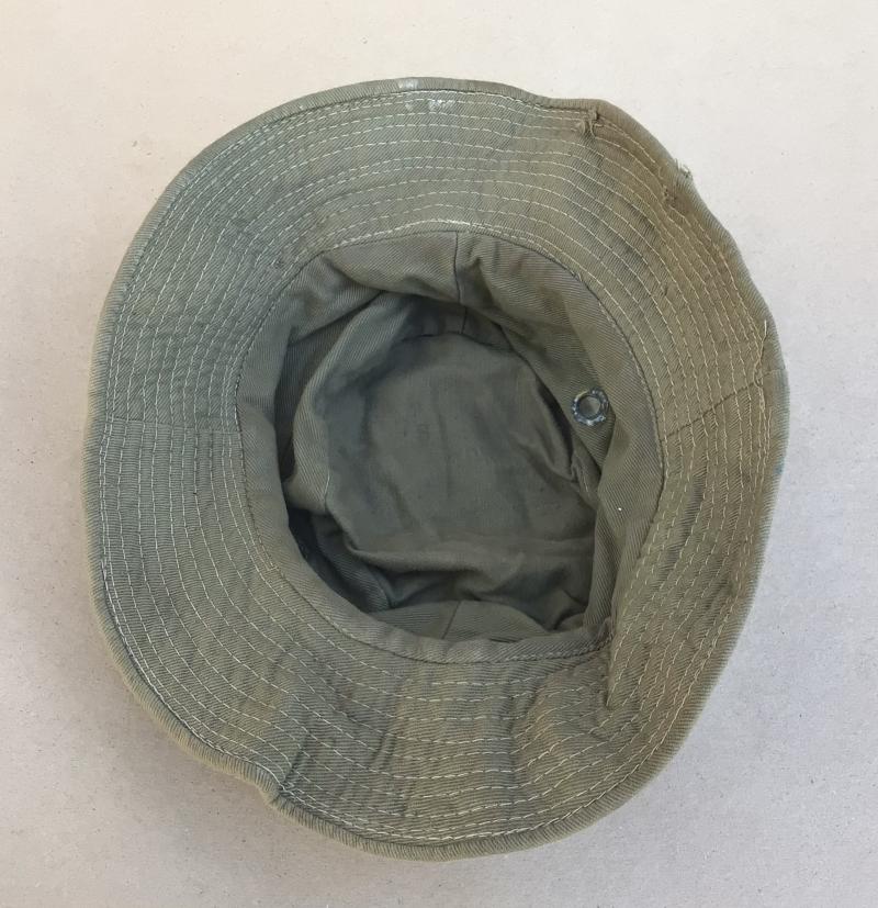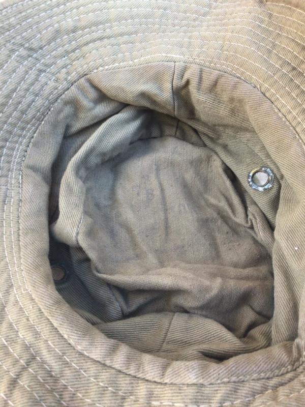 The “Jungle Service Hat” for Far East Theatre of operations. Light khaki - green cotton. The ink size and makers. Ode stamps are faded and only slightly visible but not quite legible. The stitching pattern and air vents confirm it being a WW2 issue example. Sworn and used example.