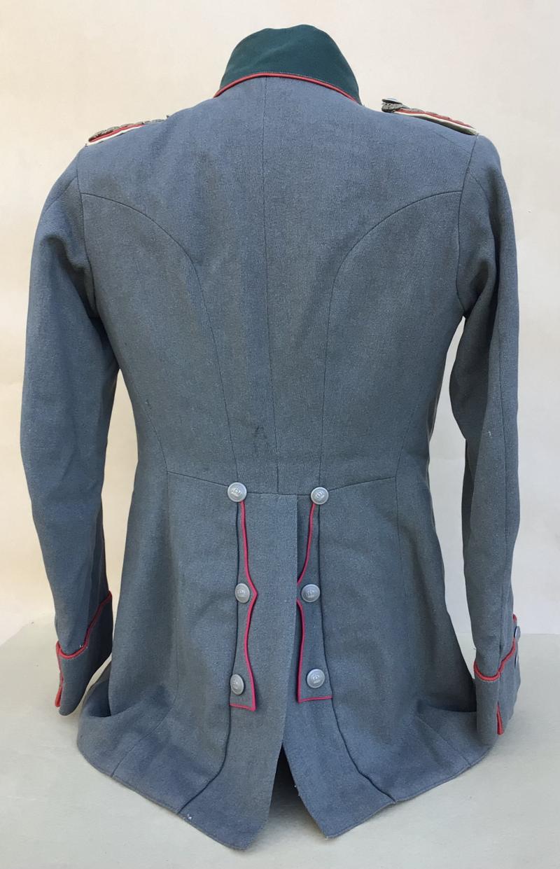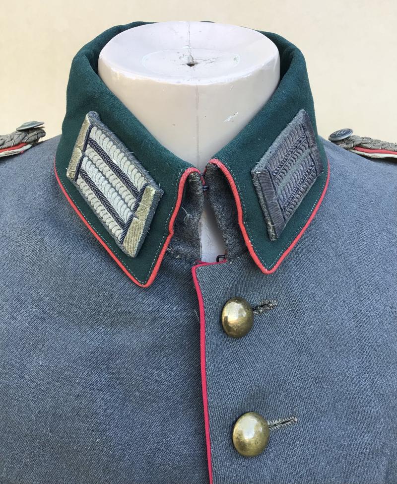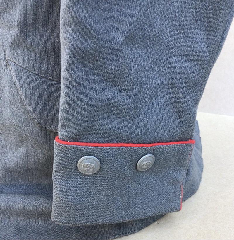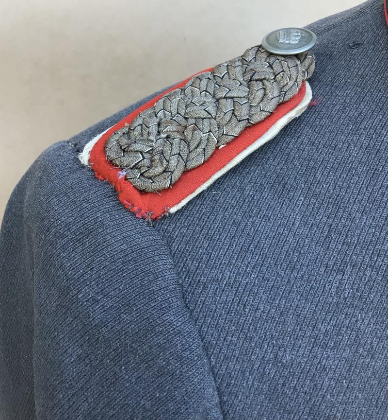 A well worn and partly restored example of the officers M1910 pattern service dress tunic in field grey wool. The two top breast pockets have been removed and clearly evidence of having such previously. I have seen this before on a number of Imperial German tunics both officers and other ranks, the reason why is unknown to me but seems to correlate with immediate post war or Freikorps period use. Fitted with plain brass buttons. Green wool stand and fall collar now with M1916 Special Duty Officers collar litzen. These are a very close match and display quite well but are not a matching pair.Swedish cuffs with subdued litzen and M1916 Prussian buttons. The M1915/16 officers subdued shoulder straps for a Major in grey with white and black Prussian fleck. Both shoulder board have been re-sewn directly to the tunic.The pleated rear skirt also with buttons and duel scarlet and crimson pink piping ( possibly General Staff ?)