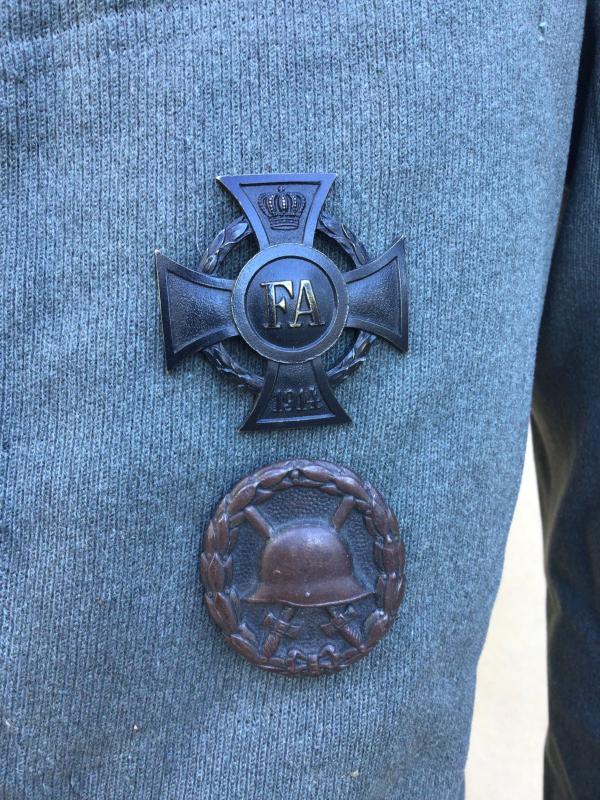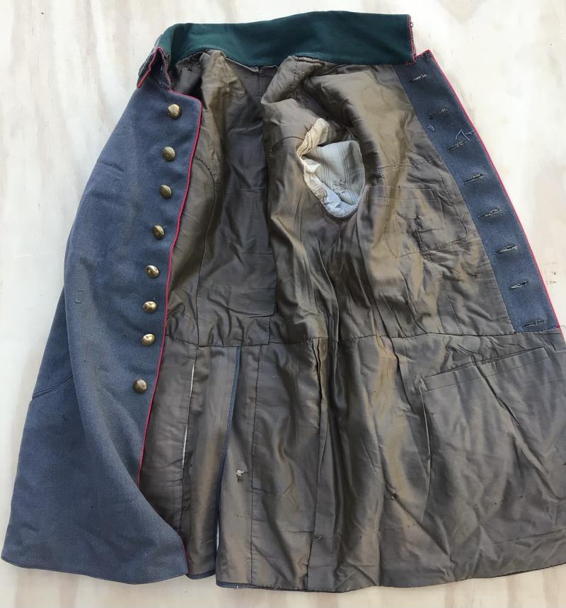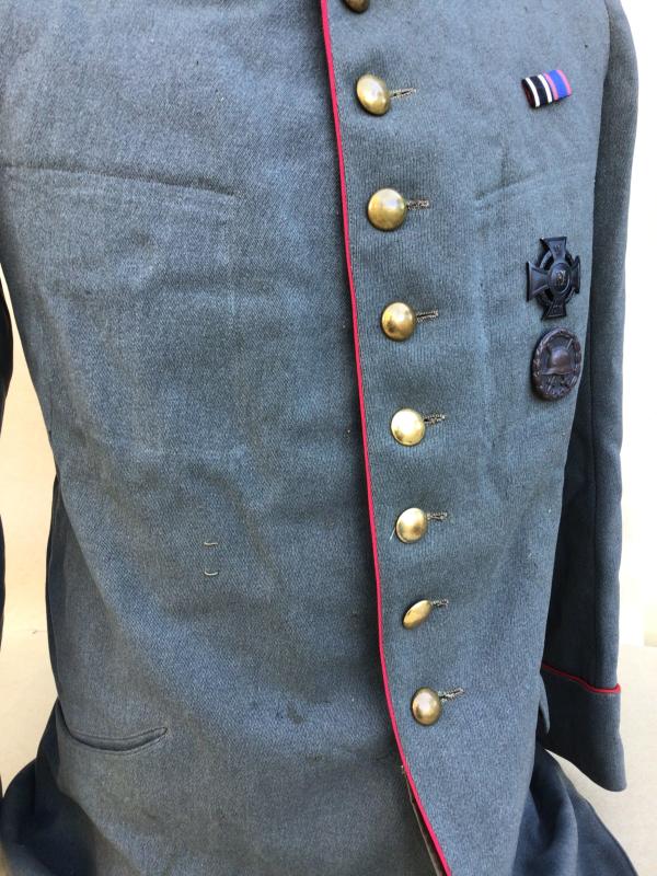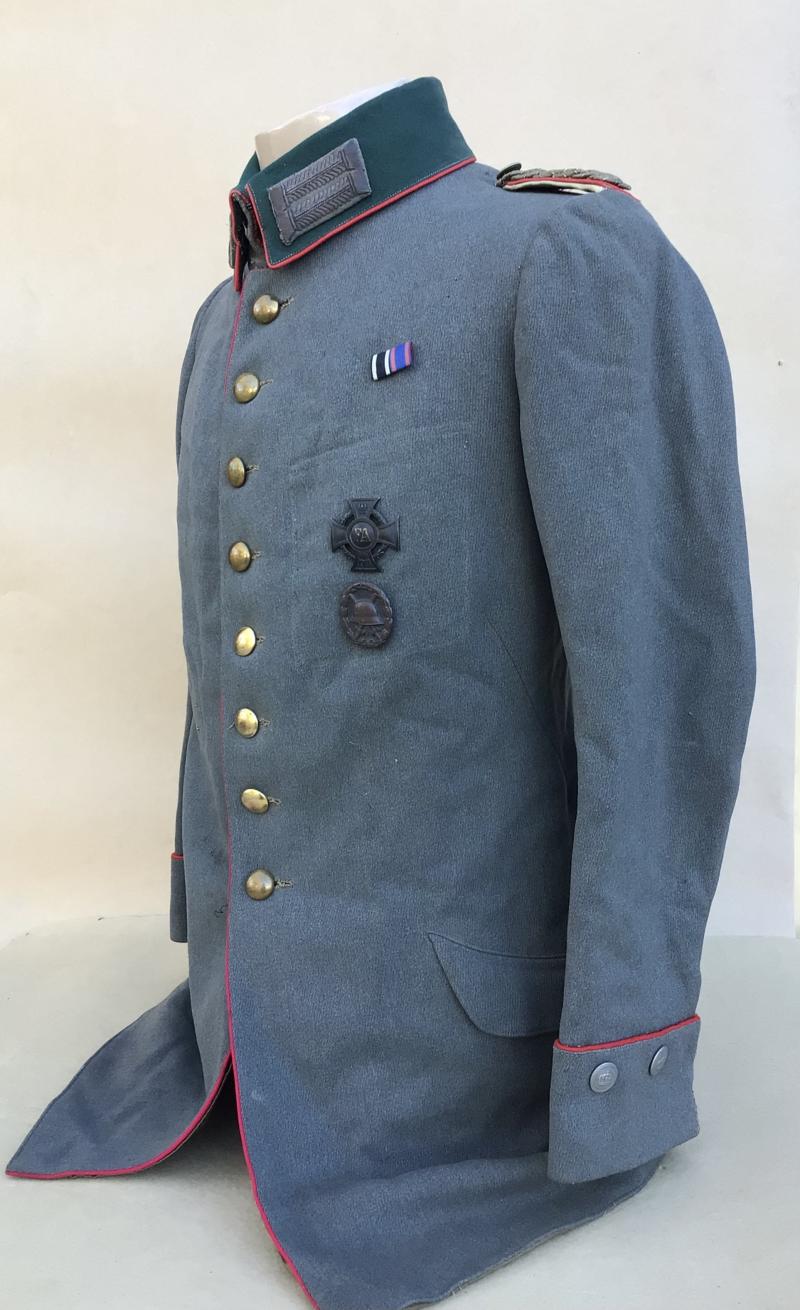 Comes fitted with a two place ribbon bar for the 1914 Iron Cross 2nd class and Oldenburg Frederick August Cross 2nd Class. A screw back Oldenburg Frederick August Cross 1st Class. This is probably an extremely good copy medal. The hole not overlocked and put straight through the tunic. An original and 1918 Black Wound Badge now worn back to the base metal. Full cotton / silk lining to the body and tailors striped cotton lining to the sleeves.