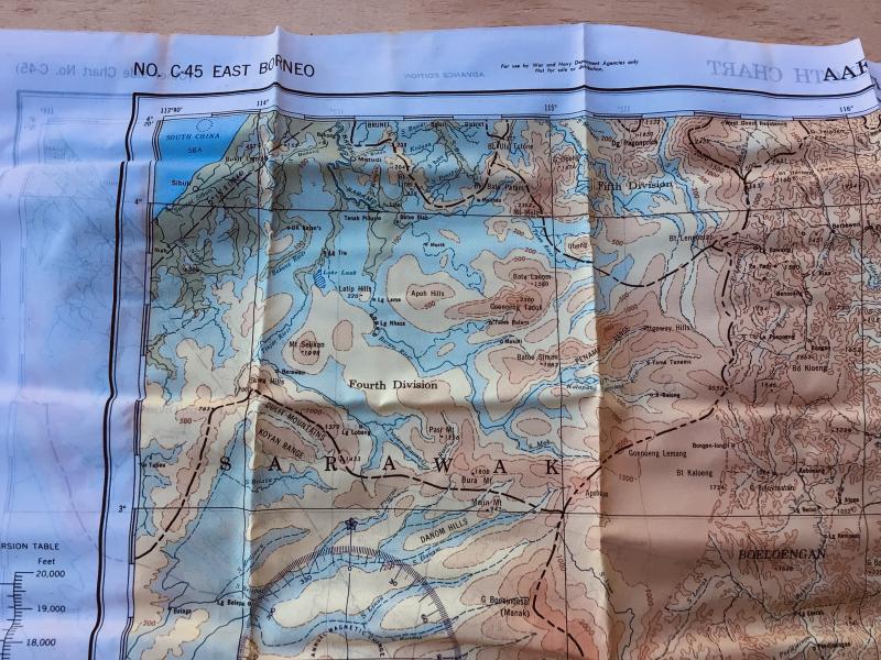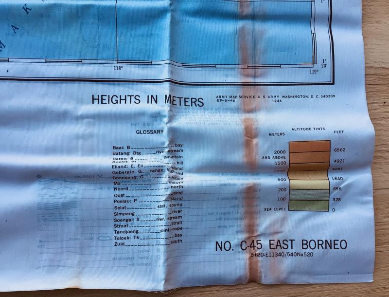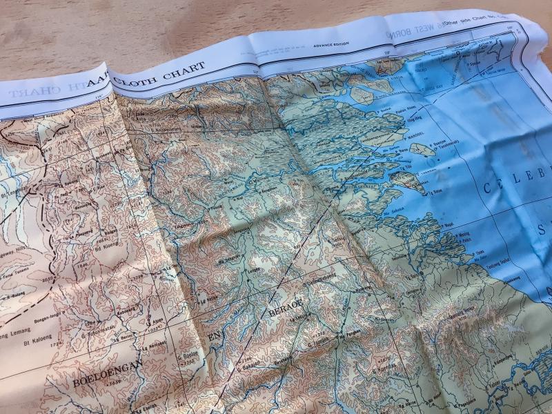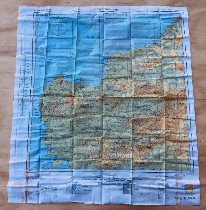 As issued and used by the RAAF US Army Air Force cloth map , escape and evasion. No. C46 West Borneo and the reverse side No.C45 East Borneo. 1944 dated. Approximately 66cm x 78 cm.