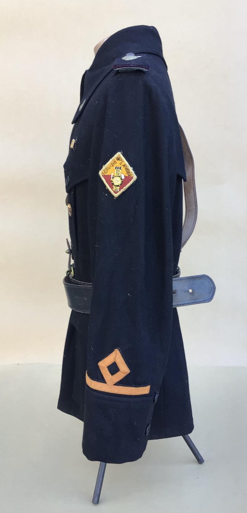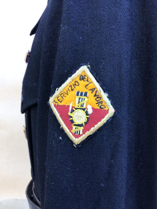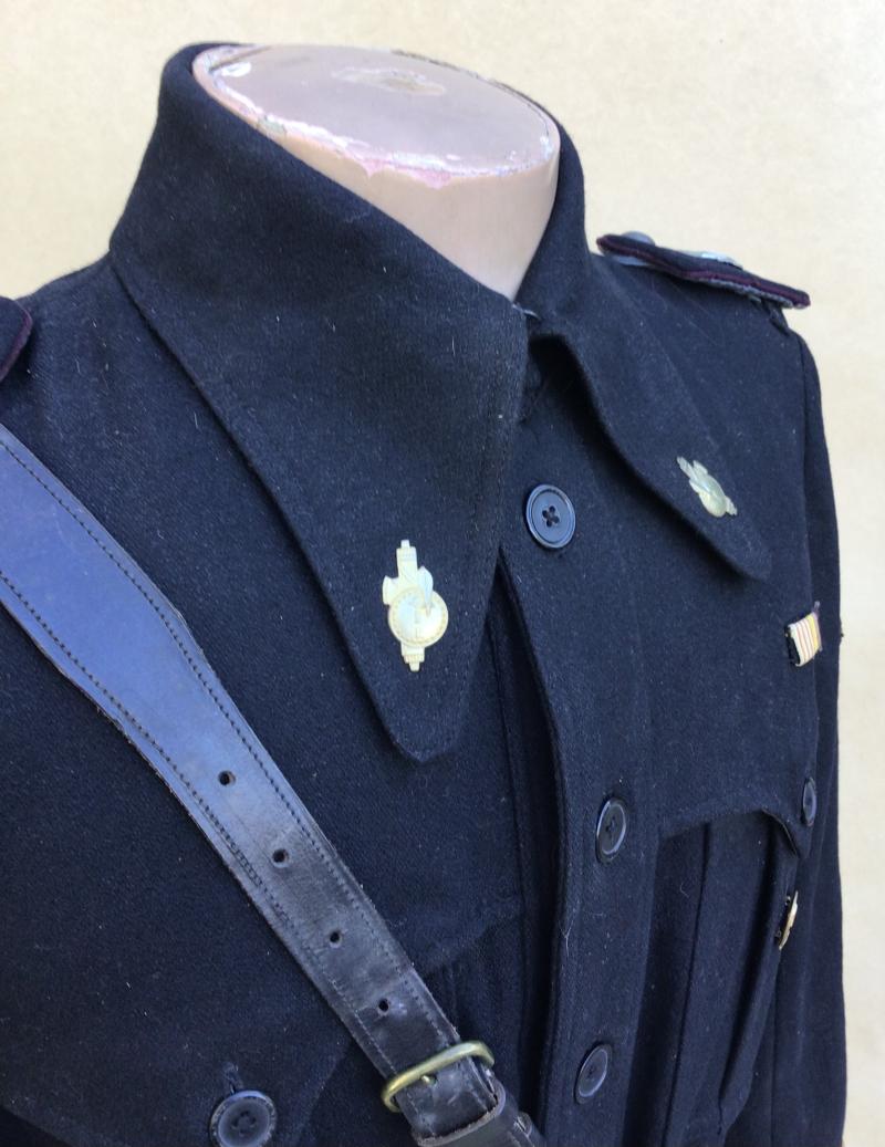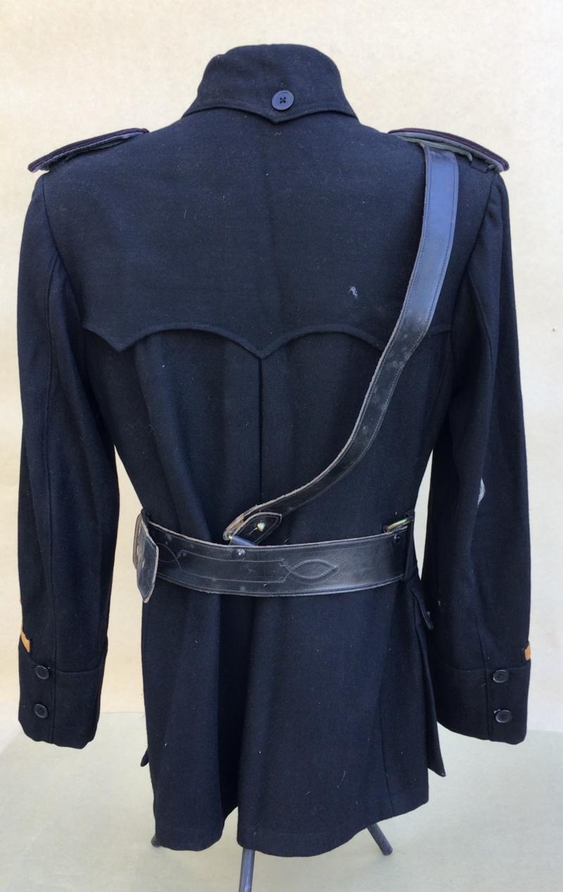Black wool four pocket “Sahariana” pattern tuinc with plain black buttons and GLI metal collar badges. The detachable shoulder straps also with metal GLI badges. Embroidered sleeve badge and cuff rank for a Lieutenant. Two place ribbon bar and GLI membership breast badge. Together with a matching black leather belt and cross cross strap. No internal label. Not named. Overall in very good condition.