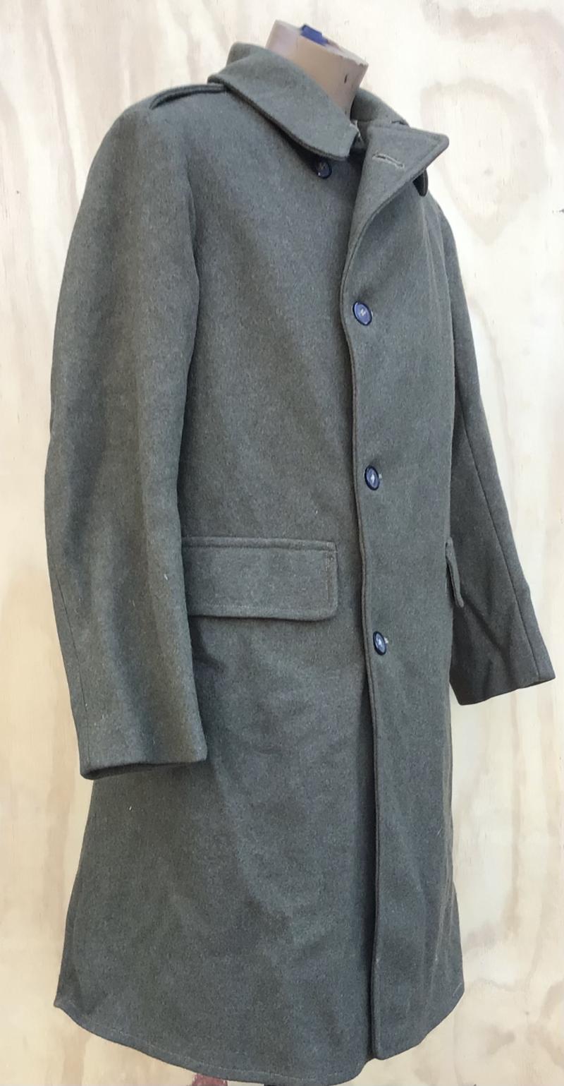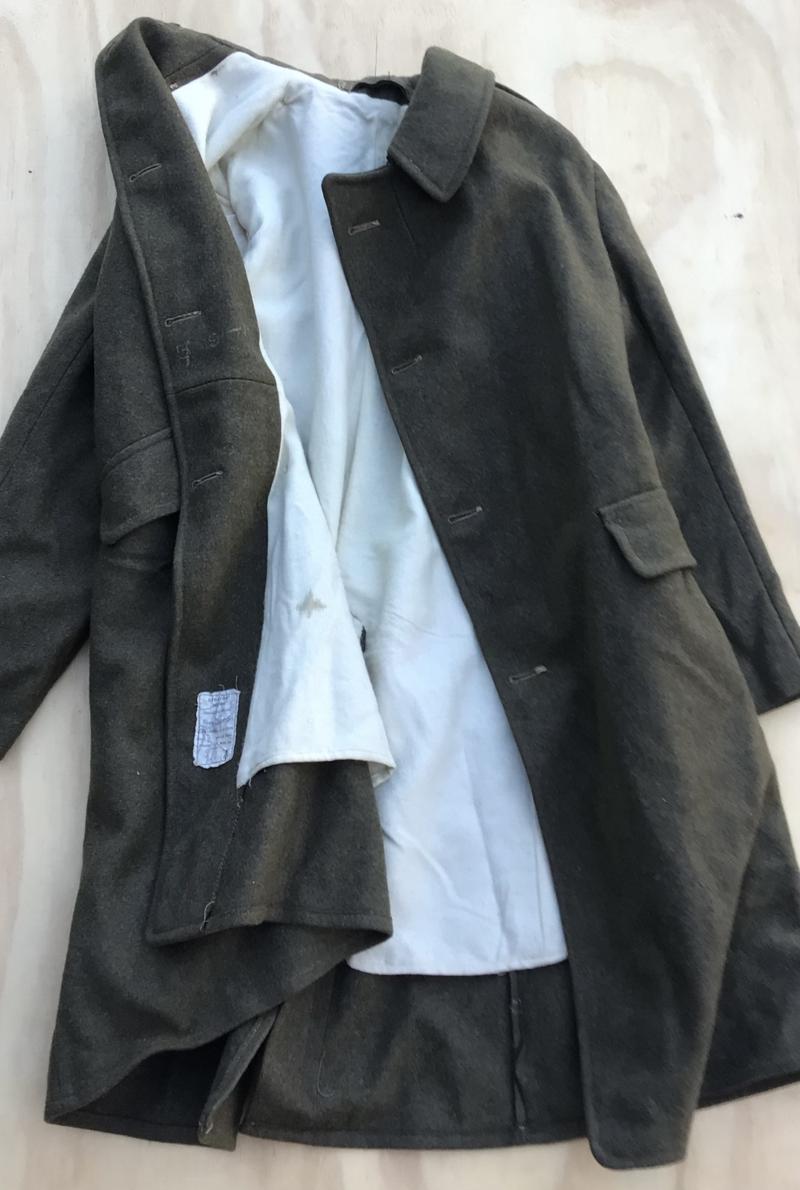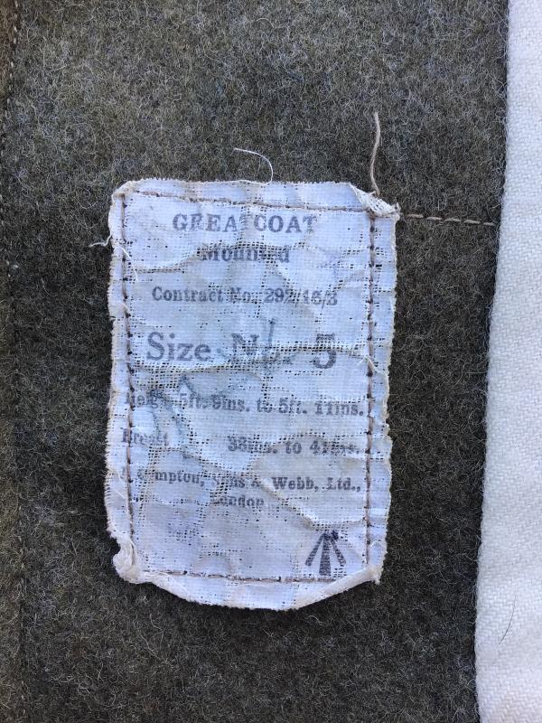 Basically a Pattern 1915 Other Ranks Mounted Coat in khaki wool. Plain civilian style flat buttons.Full White blanket wool lining. An indication of not being a Great War made item when material was in shortages. The inside ordnance label marked “Greatcoat Mounted Contract No. 292/16/3” With broad arrow acceptance mark. The date has worn off. So with that I’m suggesting it’s an inter war or WW2 period example. No rear adjusting belt. Heavy khaki wool with white cotton lining.