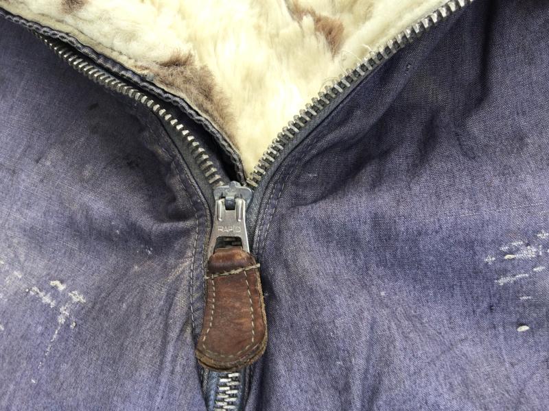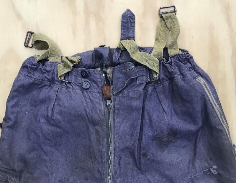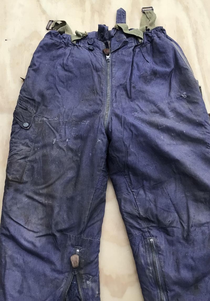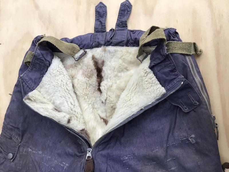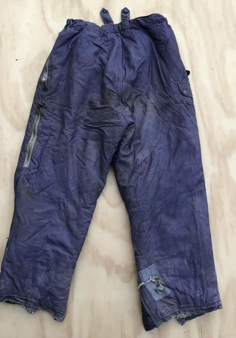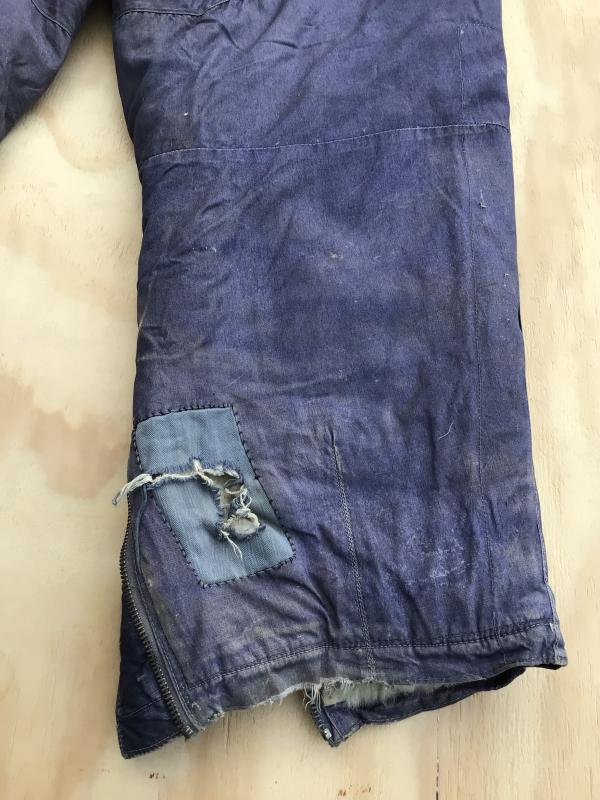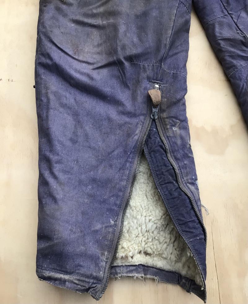 Original German WWII Luftwaffe Blue cotton Fleece Lined Channel Trousers. A lovely well used service used pair showing various repairs and soiling. Has all the original working zippers ,tabs and buckles. Overall wear, stain and repairs.