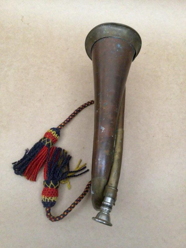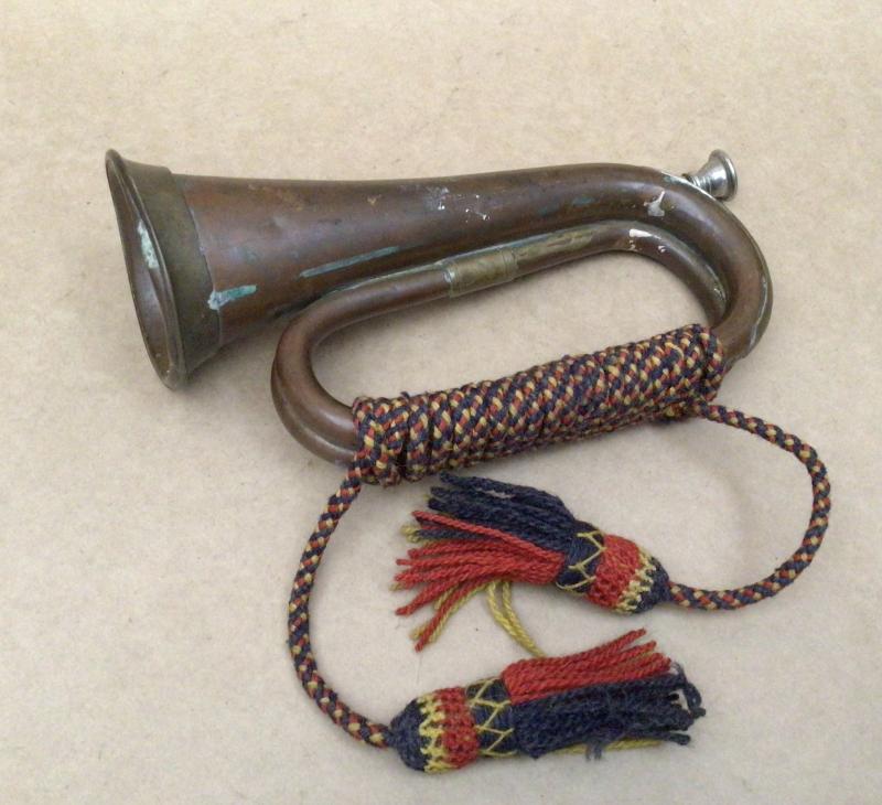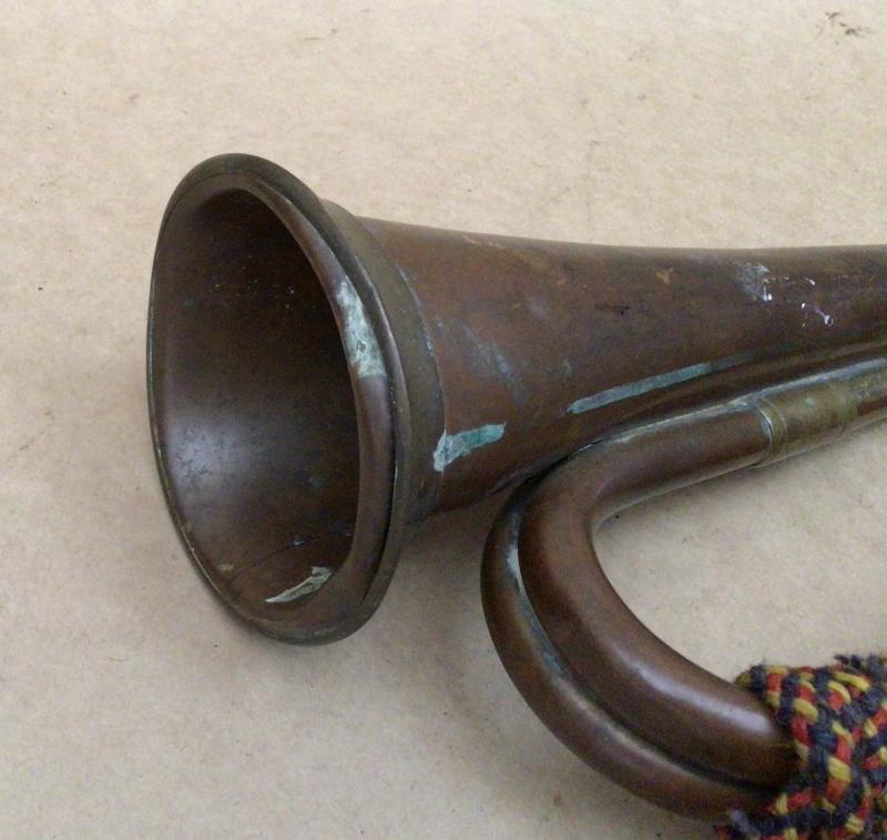 c.WW1- 1930's Brass Bugle. This example with no makers marks or dates. Comes with a fitted set of bugle cords. Overall tone, wear and some dents.