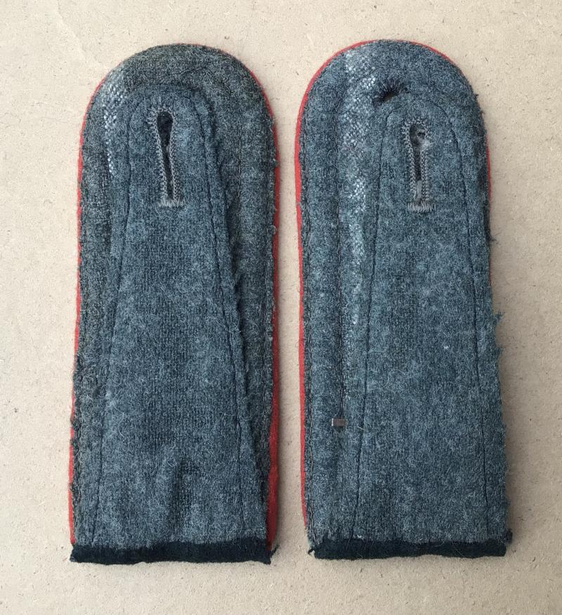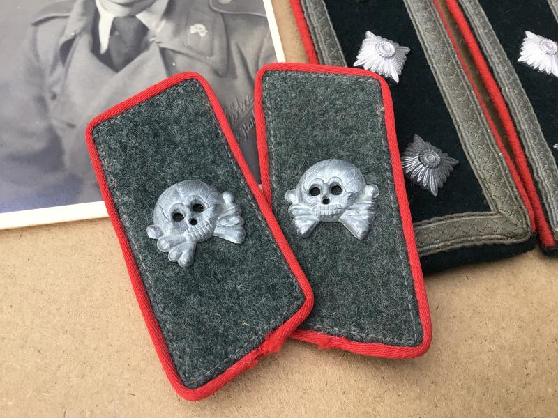 A rare original set of collar tabs and shoulder straps for a Senior NCO Armoured Assault Gunner (Sturmgeschütz). Zinc alloy metal totenkopf badge on grey wool with red rayon (artillery ) waffenfarbe. The skulls sill with the silver frosting finish with a two prong reverse. The matching detachable shoulder straps also with red artillery waffenfarbe and a subdued NCO tresse. Together with an original studio postcard of a Sturmgeschütz Gunner wearing similar badges. Lovely condiotn and a rare matching set.