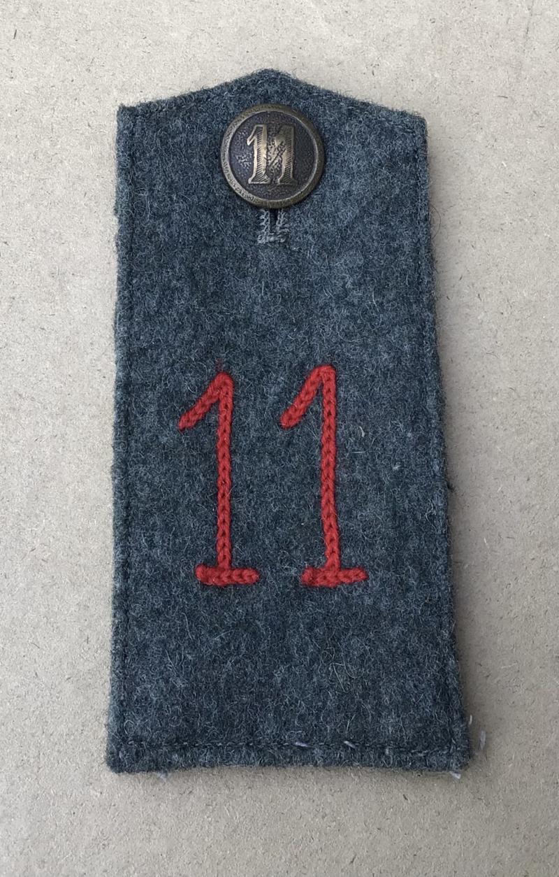 Field grey wool with chain stitched No. “11”. With matching brass button.