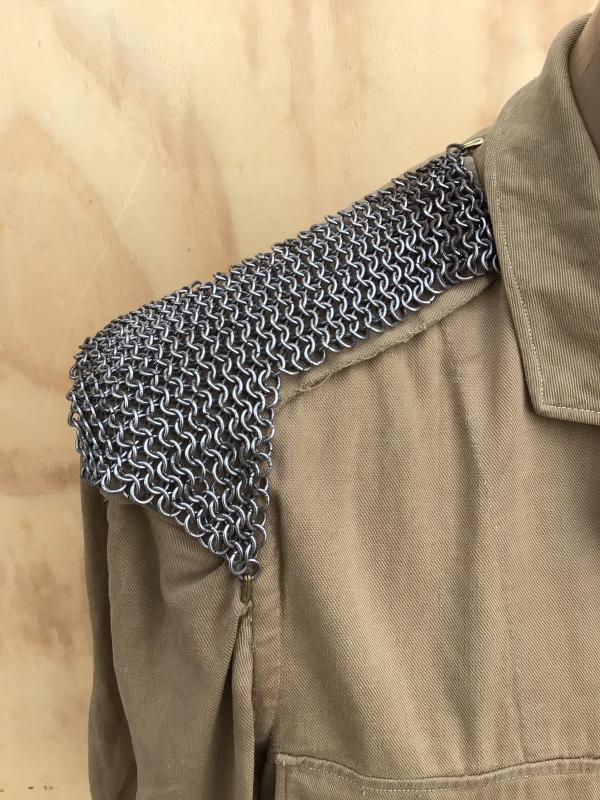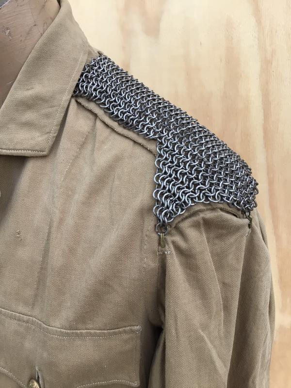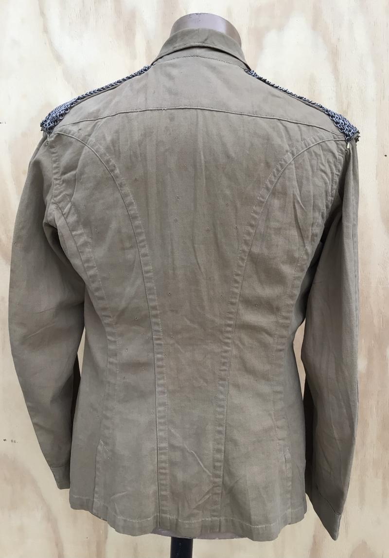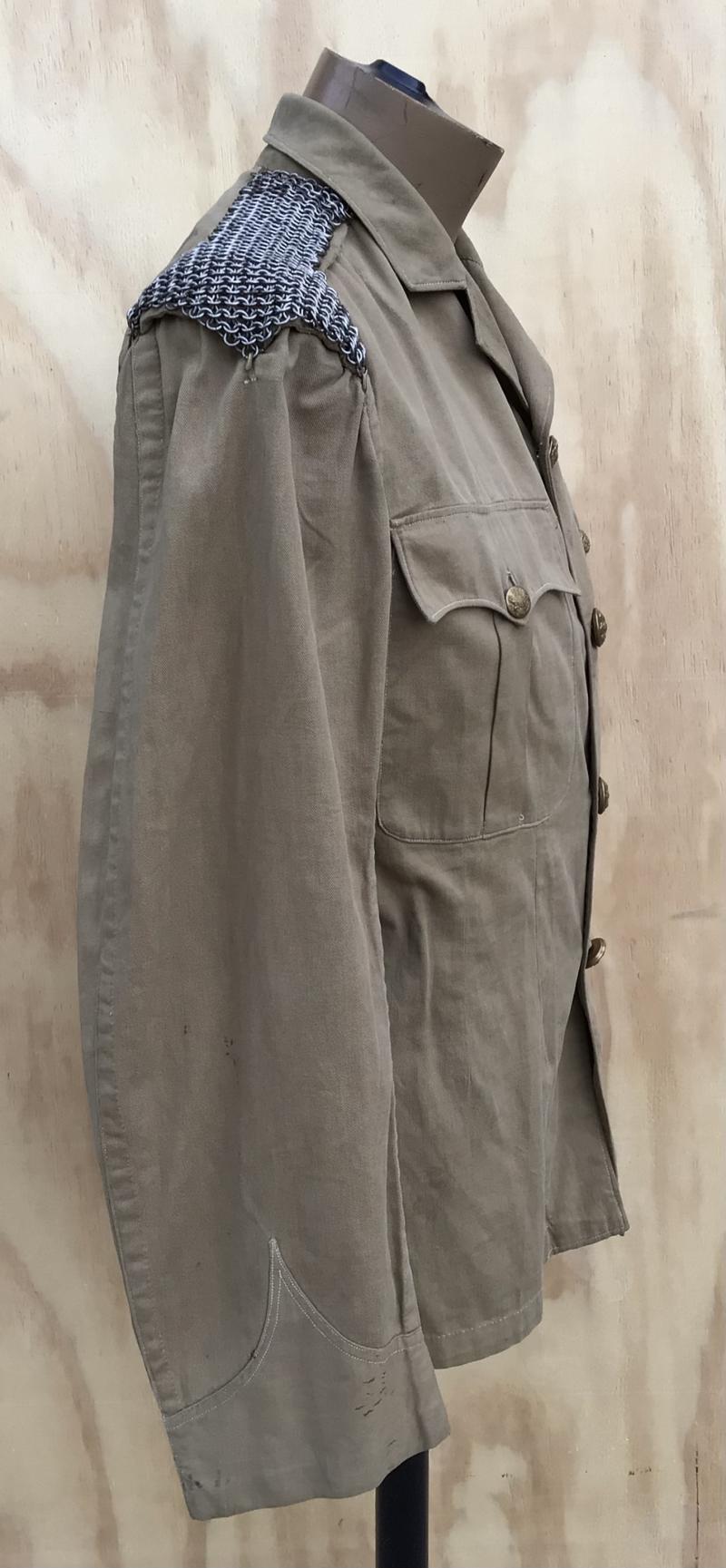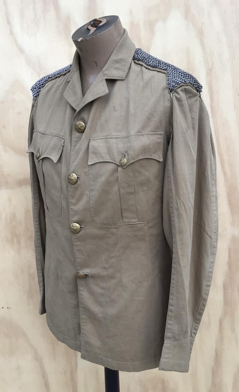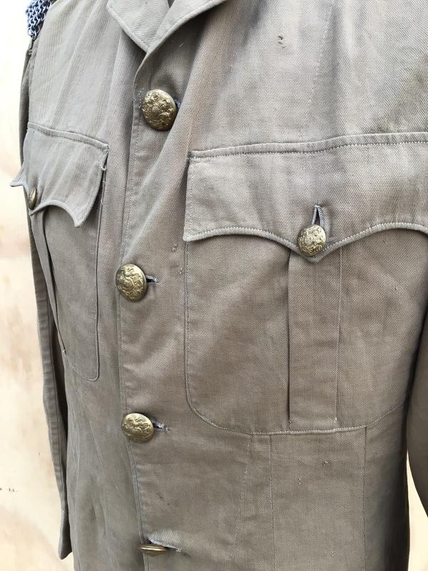 A nice example c.102-1915 of an open collar Khaki cotton with brass kings crown general service buttons and white metal shoulder chain mail. No rank but could well be worn as an officers patrol jacket with added insignia.