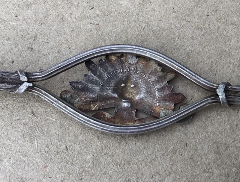 A really stunning badge in Sterling silver. Thatched horizontally lined cane with a central rising sun. Brooch pin reverse. Unmarked. 60mm.