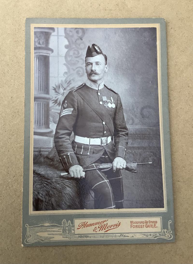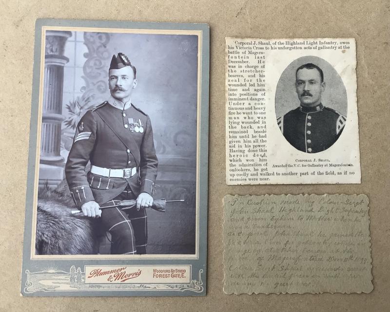 On the 11th December, 1899, during the Battle of Magersfontein, Corporal Shaul was observed (not only by the Officers of his own Battalion but by several Officers of other regiments) to perform several specific acts of bravery. Corporal Shaul was in charge of stretcherbearers; but at one period of the battle he was seen encouraging men to advance across the open. He was most conspicuous during the day in dressing men's wounds, and in one case he came, under a heavy fire, to a man who was lying wounded in the back, and, with the utmost; coolness and deliberation, sat down beside the wounded man and proceeded to dress his wound. Having done this, he got up and went quietly to another part of the field. This act of gallantry was performed under a continuous and heavy fire as coolly and quietly as if there had been no enemy near. He later achieved the rank of Sergeant Bugler (a Bandsman in charge of the Bugle Platoon) in the British Army and served in the South African Army in World War I as a Bandmaster. John Shaul is the only former pupil from the Duke of York's Royal Military School to have been awarded the Victoria Cross. The medal is in the Lord Ashcroft VC Collection.