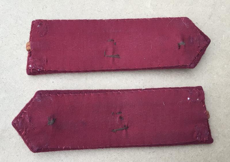 Maroon or wine red wool with a red Russia braid stripe. 1902-1911 period dull brass King Edward VII buttons and matching dull brass rising sun badges sewn onto the wool felt.