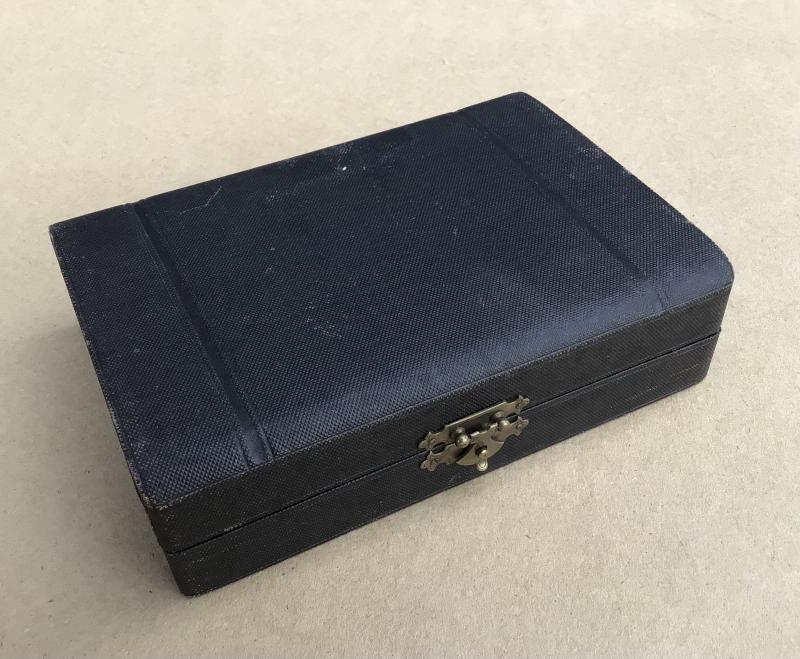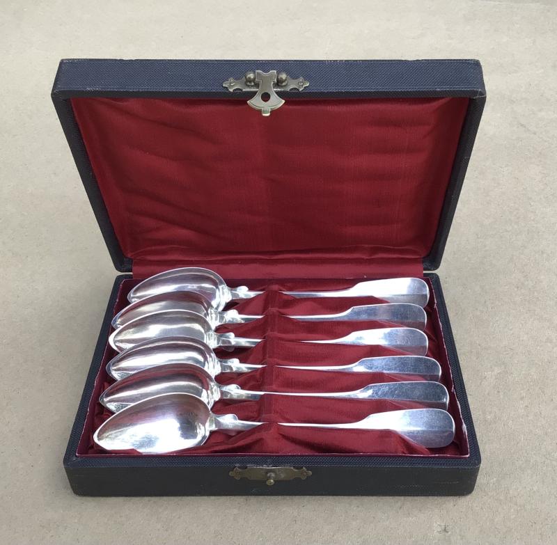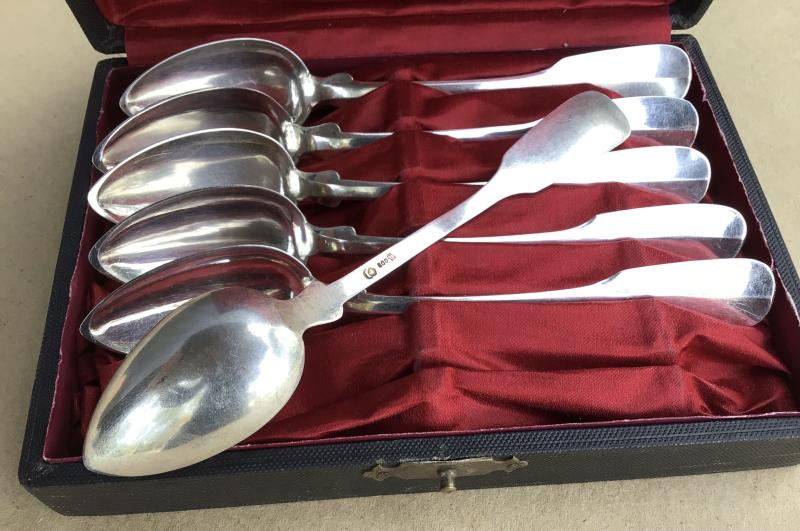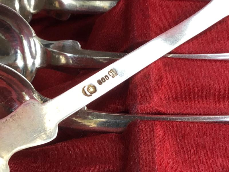 A Private civilian set of six matching tra spoons in a a large hard shell black leatherette case with red silk fitted lining. Each spoon with Imperial German hallmarks (Crescent and Crown or Halbmond und Reichskrone for silver), a maker's mark, and a silver fineness standard 800.