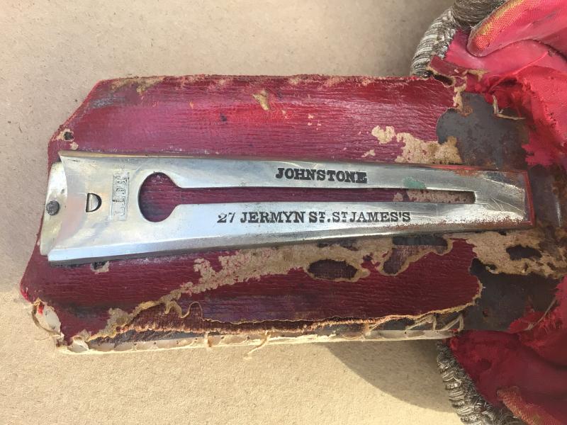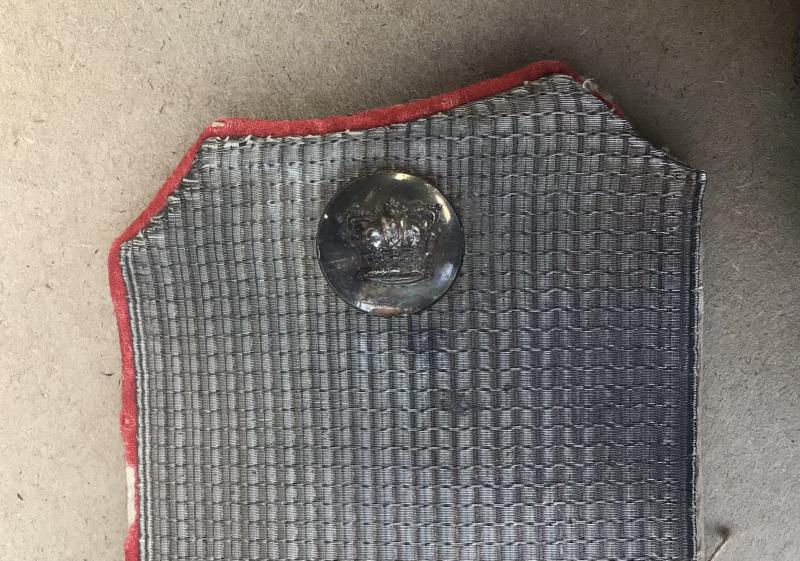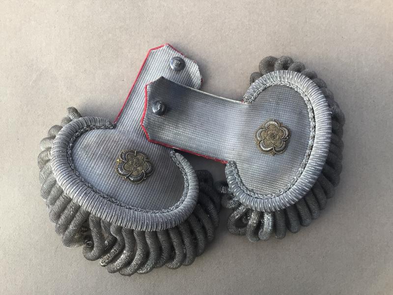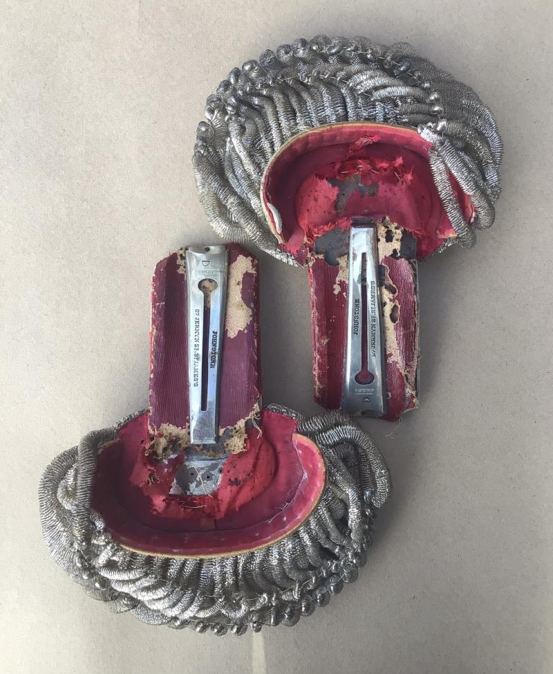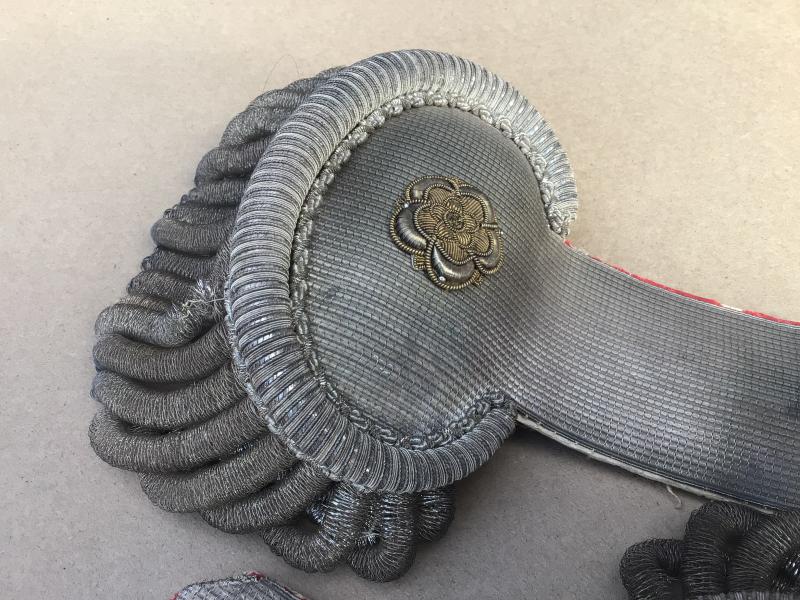 Matching pair in silver bullion and lace. To each an English Rose insignia. Both with a white metal QVC button. The reverse to each with heavy wear a moth damage.