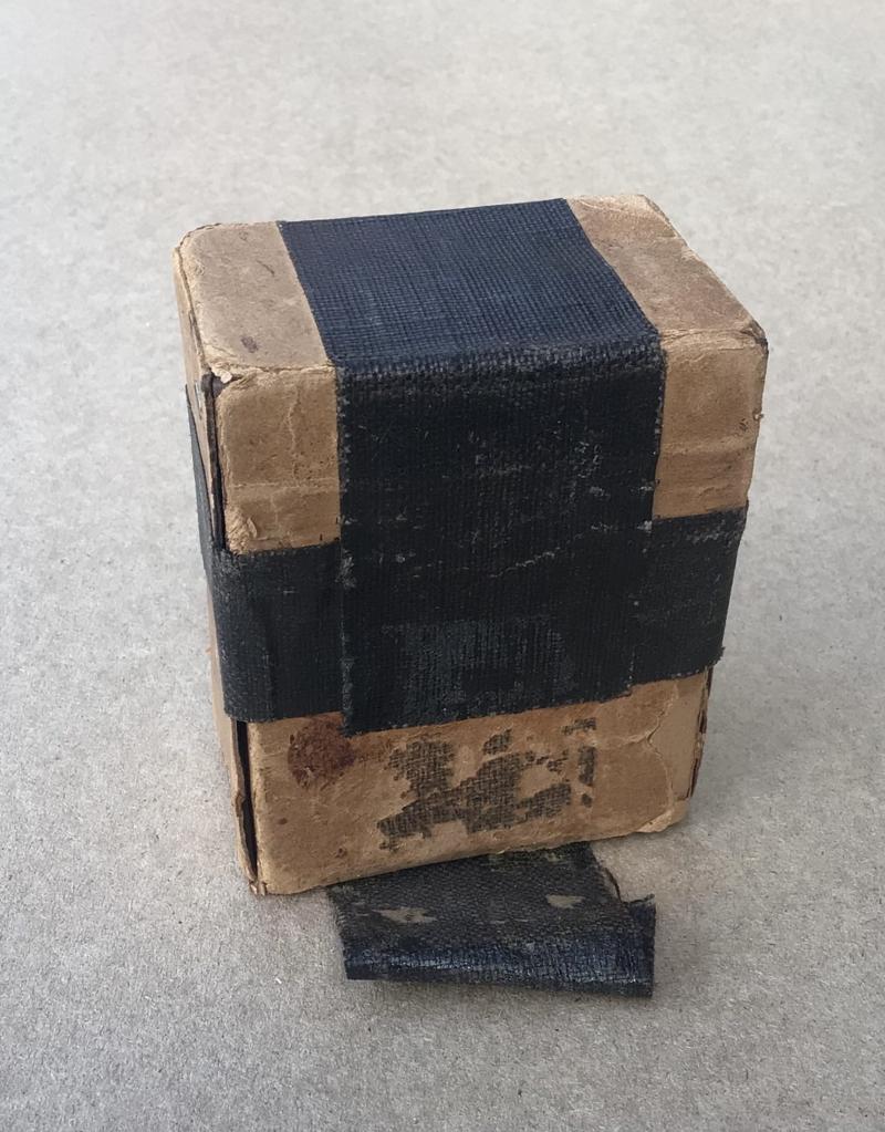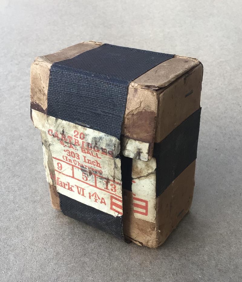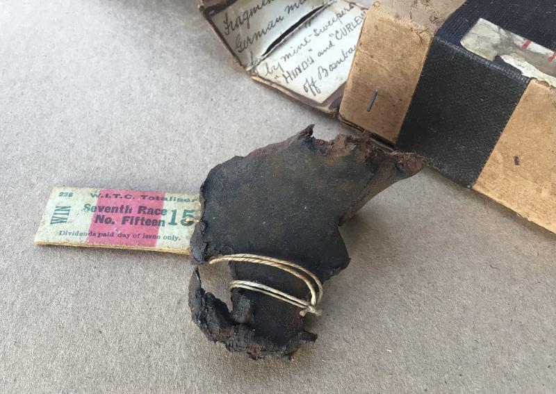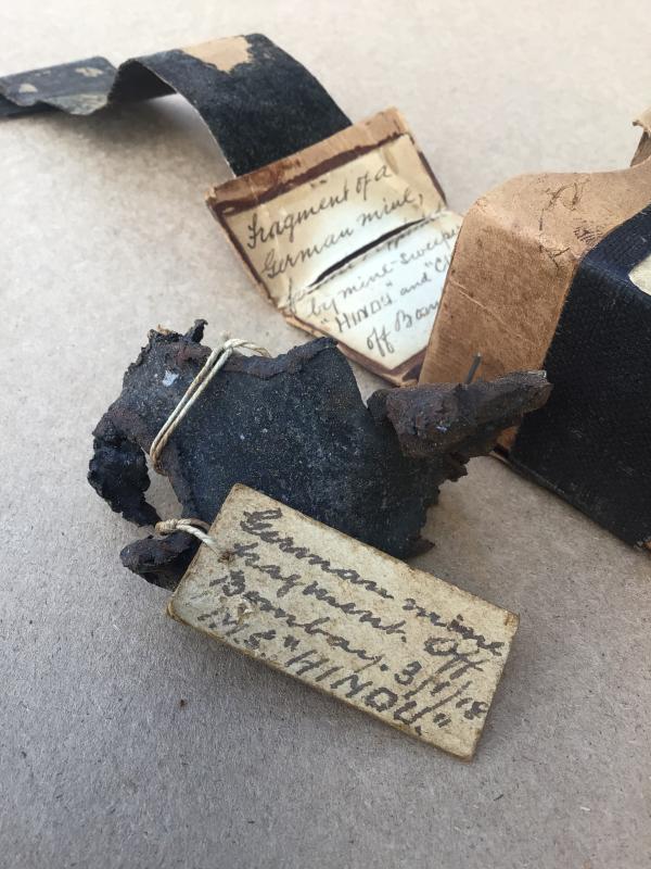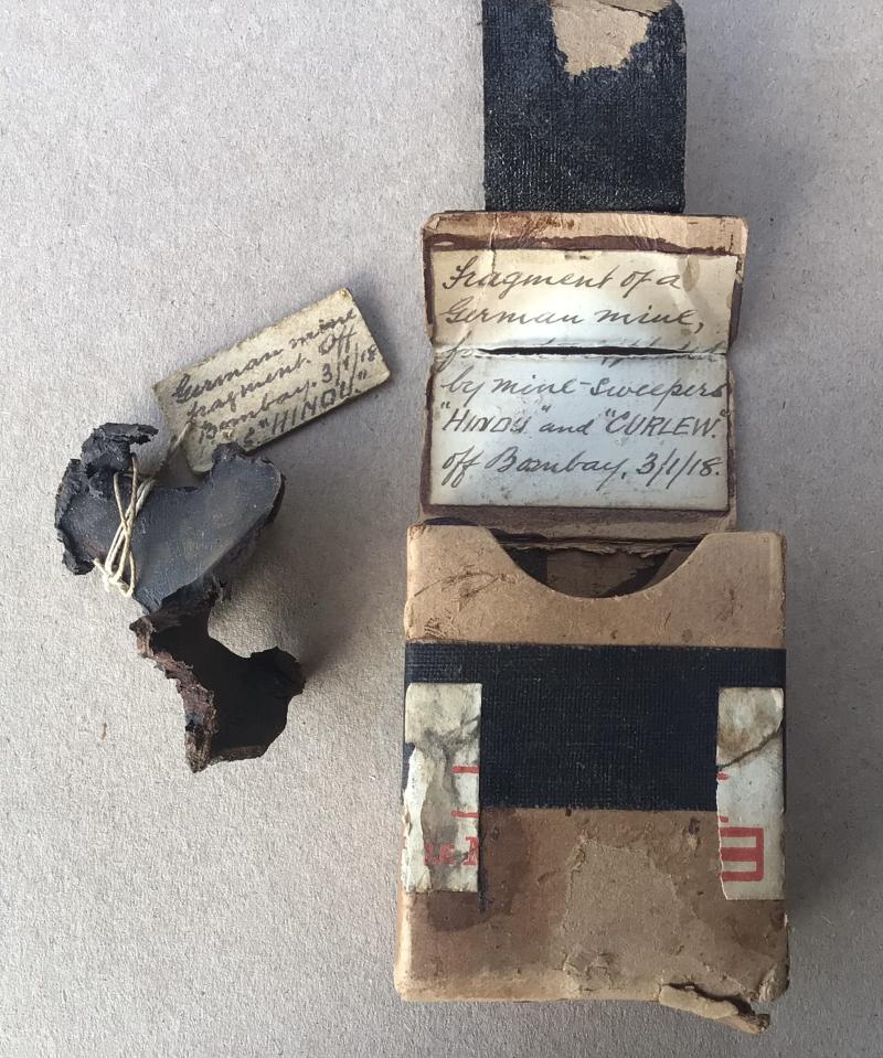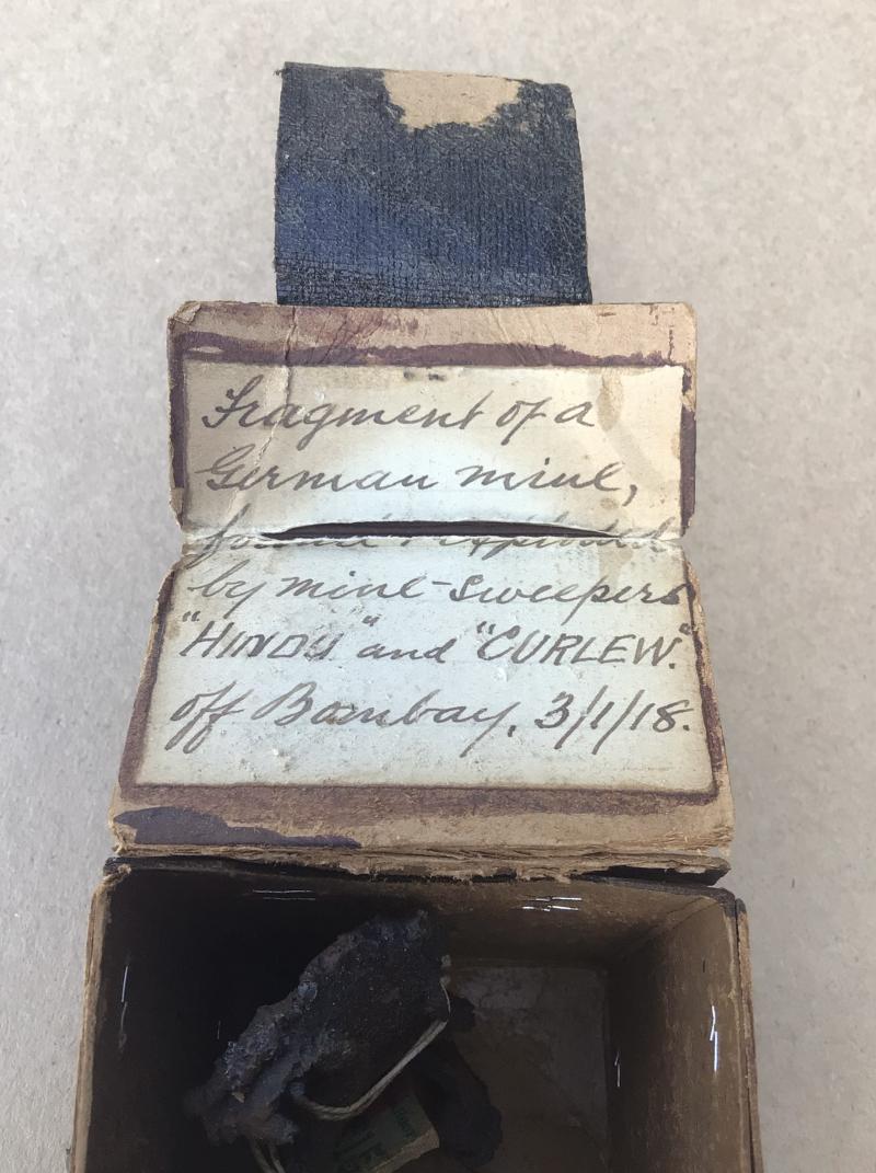 A fantastic little display item. An original car box for .303 Small arms ball ammunition dated 1913. This with a hand written label on the inside.“Fragment of a German Mine found by mine sweepers “Hindu” and “Curlew” off Bombay 3/1/18”.