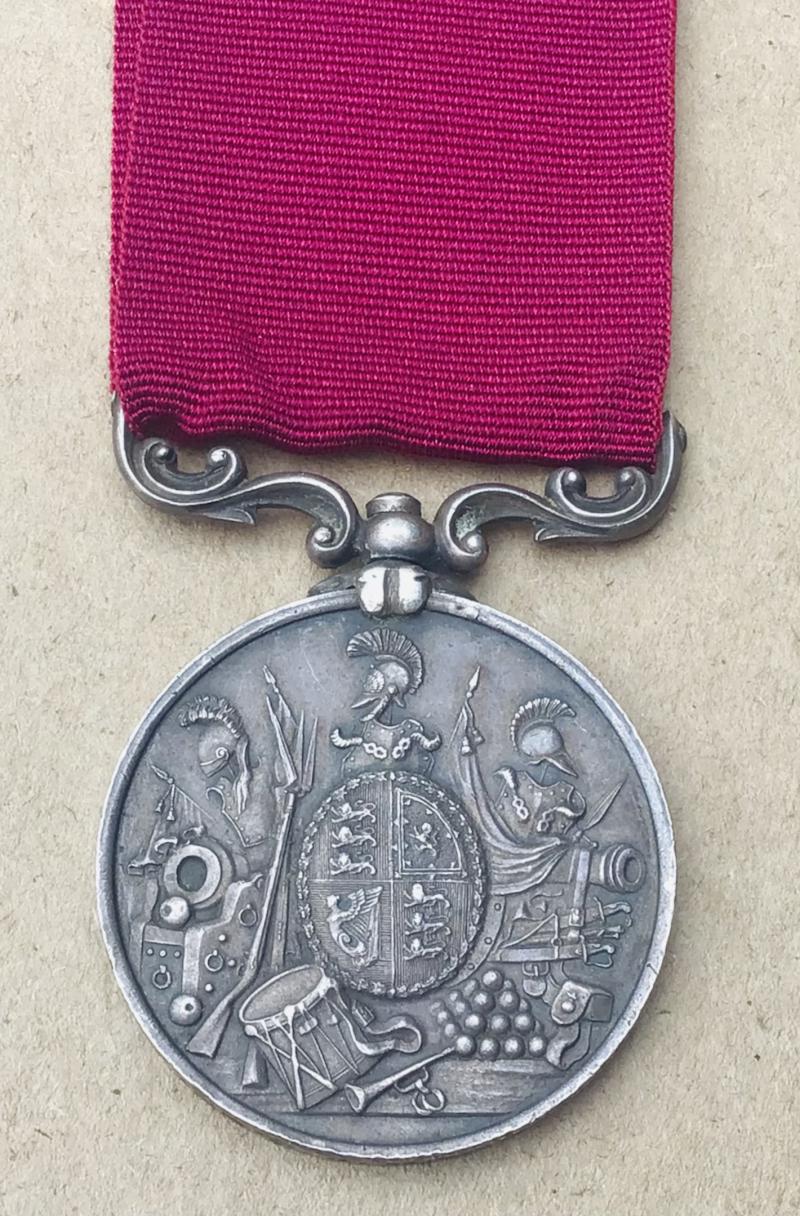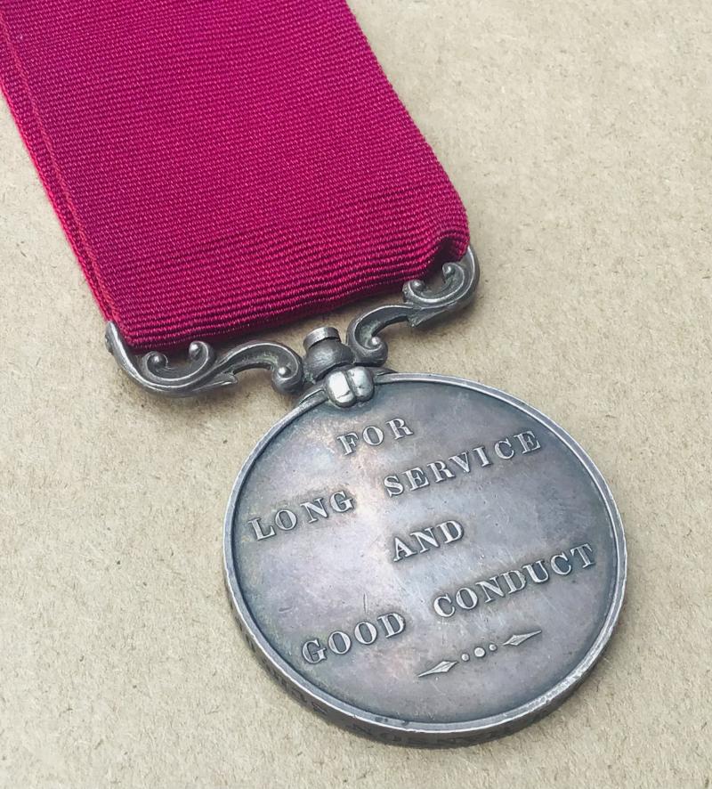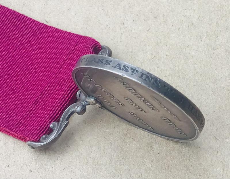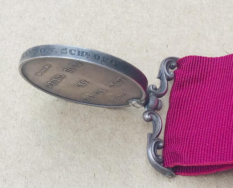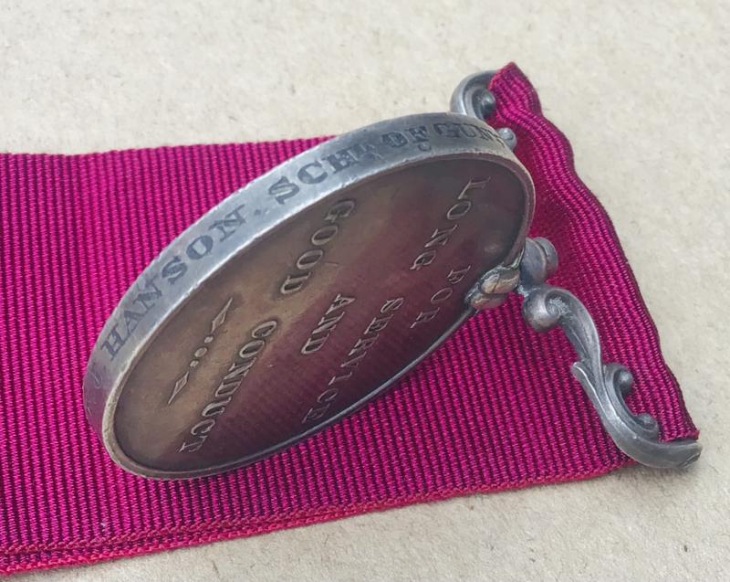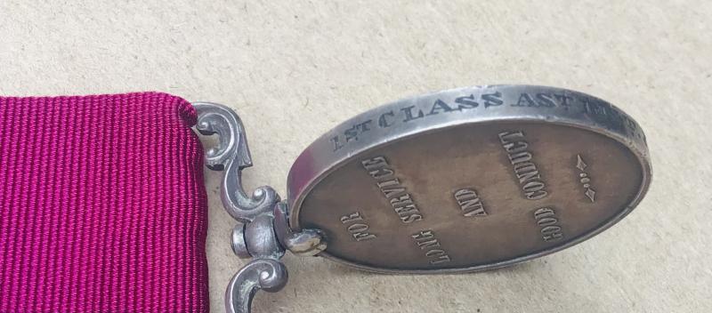 Type II. Victorian period issue. (Trophy of Arms). c.1874-1901. Impressed in large Roman capitals (1ST CLASS AST INST J HANSON SCHL OF GUNY RA). Replaced ribbon .