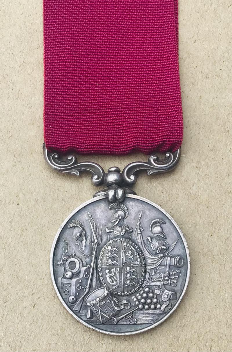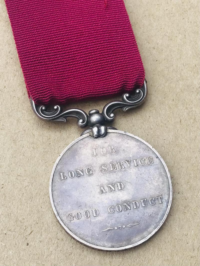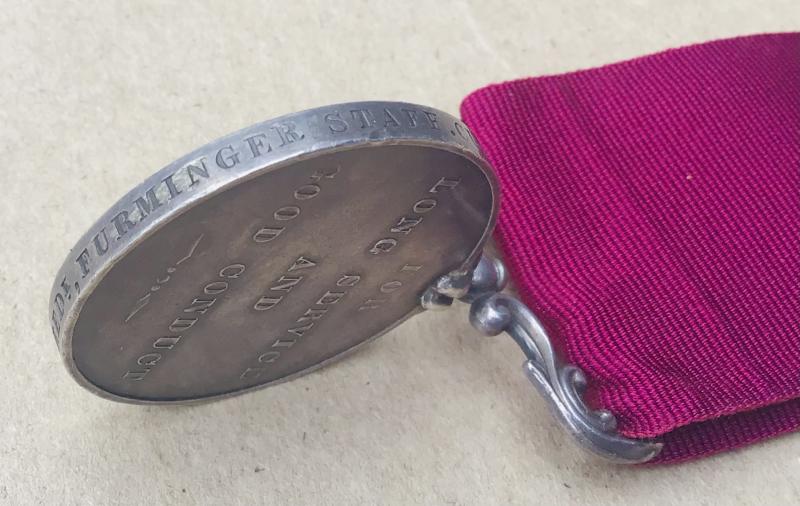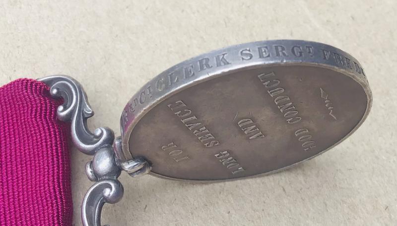 Type II. Victorian period issue. (Trophy of Arms). c.1874-1901. Impressed in large Roman capitals (3rd CL CLERK SERGT FREDK FURMINGER STAFF CURRAGH). Replaced ribbon.
