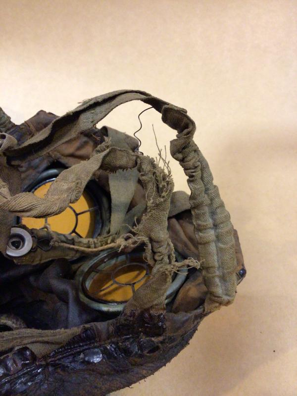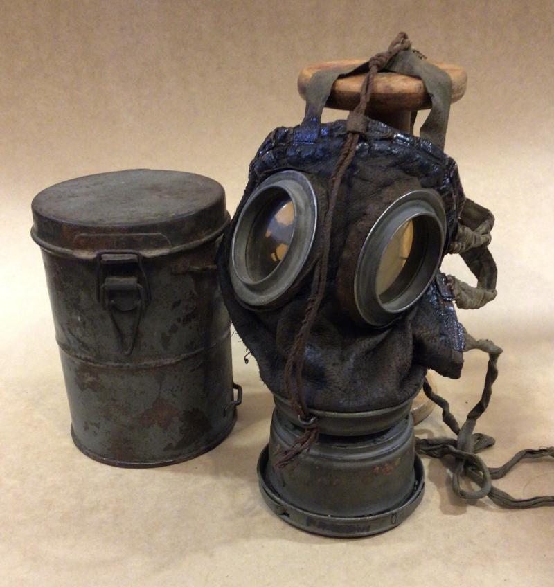 The Germans used both leather 'leder' and rubber 'gummi' masks during the First World War. Sometimes referred to as 'model 1917', after the year of its introduction, this style of gas mask was also known as the 'Ledermaske (Gasmaske 17)'. The spoked metal devices on the inside of both lenses were known informally as 'spiders'. These were removed on the improved Gasmaske 18.