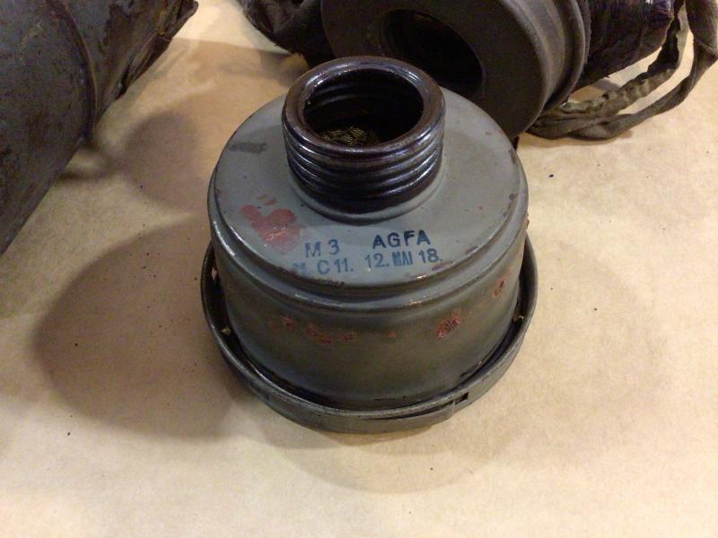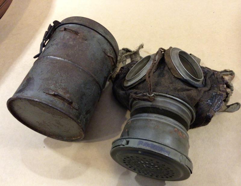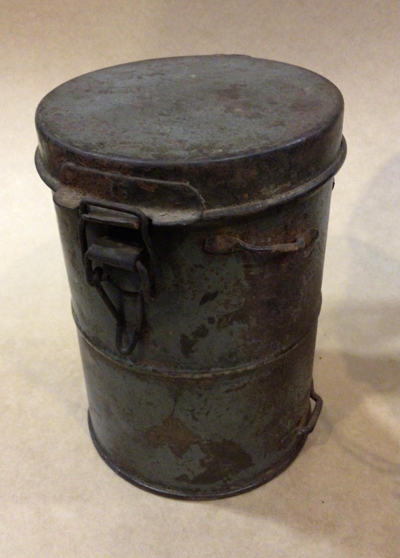 A rusted and scratched grey-green canister filter unit dated 1918. The canister with most of its original field grey green finish is missing its carry strap/sling but retains a set of spare eye lenses. in the lid.