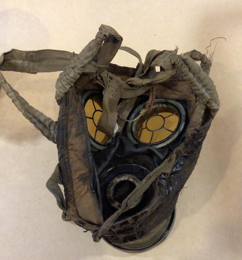 German M1917 'Lederschutzmaske' (Leather protection mask) gas mask. The mask is made from a single piece of chrome-tanned sheepskin dipped in an oil sealant solution. The single seam running under the chin and the folded edge of the mask are coated with a black sealant lacquer partially made from rubber. The circular eyepieces are made of two layers of yellowed celluloid, set in painted circular steel frames with leather gaskets where they are let into the mask. Internally, the eyepieces have removable metal 'spiders' enabling the inner layer (which was coated with gelatine to absorb moisture) to be replaced. The right 'spider' fitted to the mask has some of the inner circular metal piece missing. Khaki cotton head straps are connected to coiled springs inside cotton sleeves to keep mask in place. A long khaki cotton webbing strap attached near the chin enables the mask to be suspended around the neck.