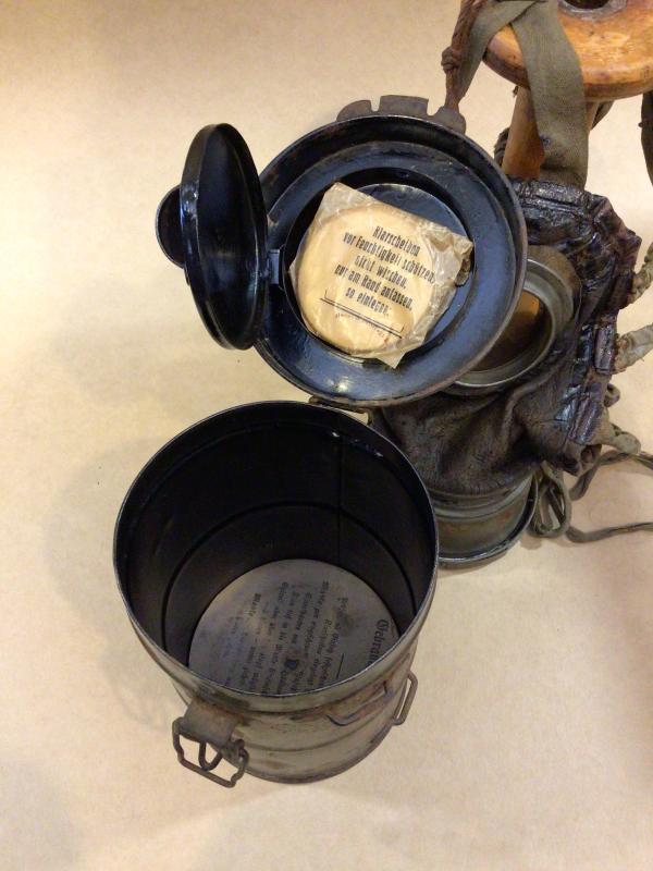 The gas mask carry case was known as a 'Lederschutzmaske (Bereitschaftsbuchen)'. This case contained a small compartment in the folding lid for spare set of lenses and usually contained an instruction sheet at the bottom explaining how to use the gas mask.
