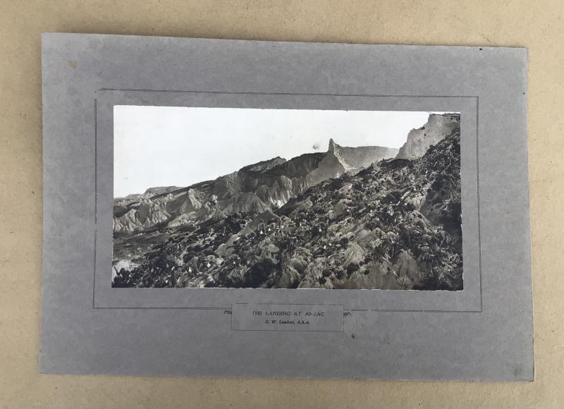 Original black and white commercial print c.1930’s, of the now famous 1922 painting by George Lambert. Australian troops ascending ridge to Plugge's Plateau, The Sphinx, Walker's Ridge and Baby 700 on skyline, steep, rocky hillside at Gallipoli, the terrain prohibitive. Many of the soldiers are dead, or falling, and there are puffs of gun smoke in the sky. A narrow beach with two landing boats can be seen in the lower left of the image. On 25 April 1915 Australian troops forged ashore. Contained in its original cardboard cover envelope. A wounderfull picture that would accompany any Gallipoli display. Approx 400 x 330mm.