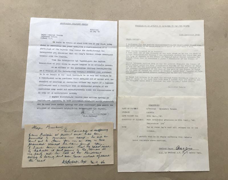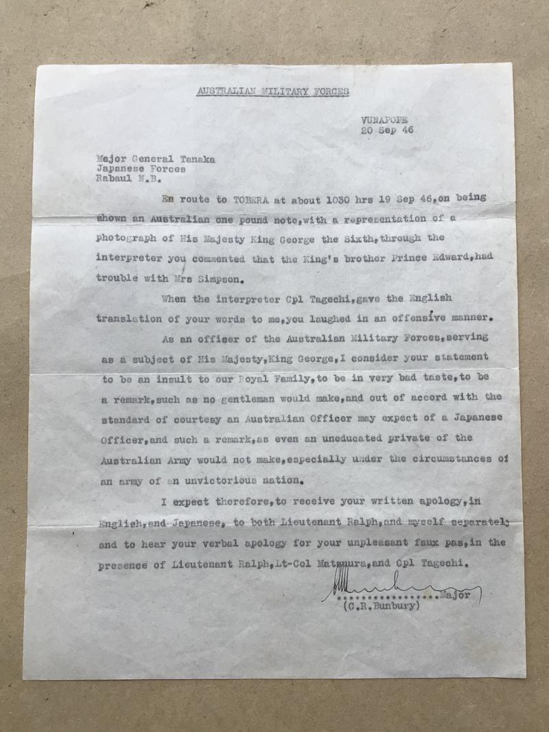 The original types official letter to General Tanaka from Major Bunbury expressing his displeasure at the insult given to the King and expecting a written apology from the General as well as a verbal apology witnessed by other AIF officers, signed by Bunbury.
