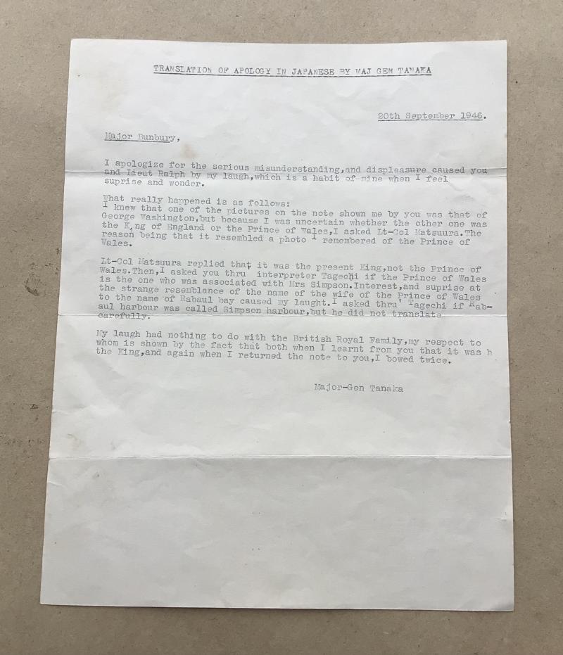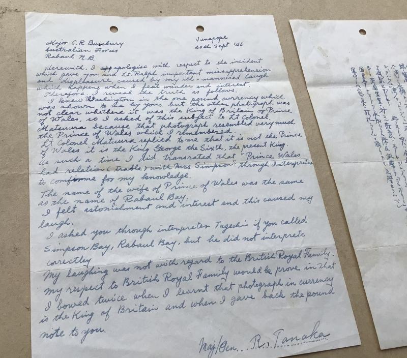 A rare original hand letter of apology to Major Clyde Bunbury hand written in Japanese and dated 20th September 1946. Apologizing for insulting the King whilst help as POW and on trial as a war criminal. Together with a hand written translation letter in English from the interpreter. Also original translation copy of the letter. Signed R Tanaka. Major General.
