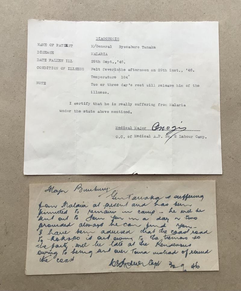 An original camp typed letter of diagnosis from the Medical officer of No.2 Labour Camp regarding General Tanaka’s condition for malaria dated 29th September 1946. Together with a hand written chit from the M.O to Major Bunbury advising him of the Generals medical condition. 30th September 1946.