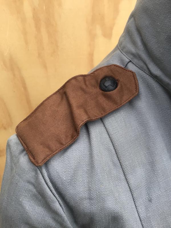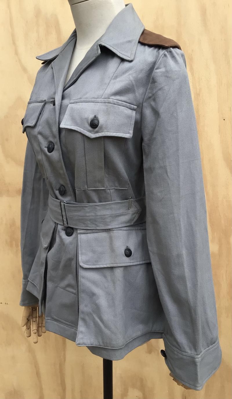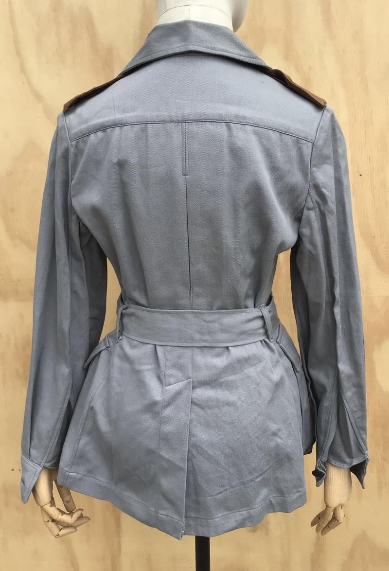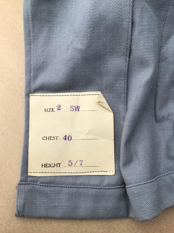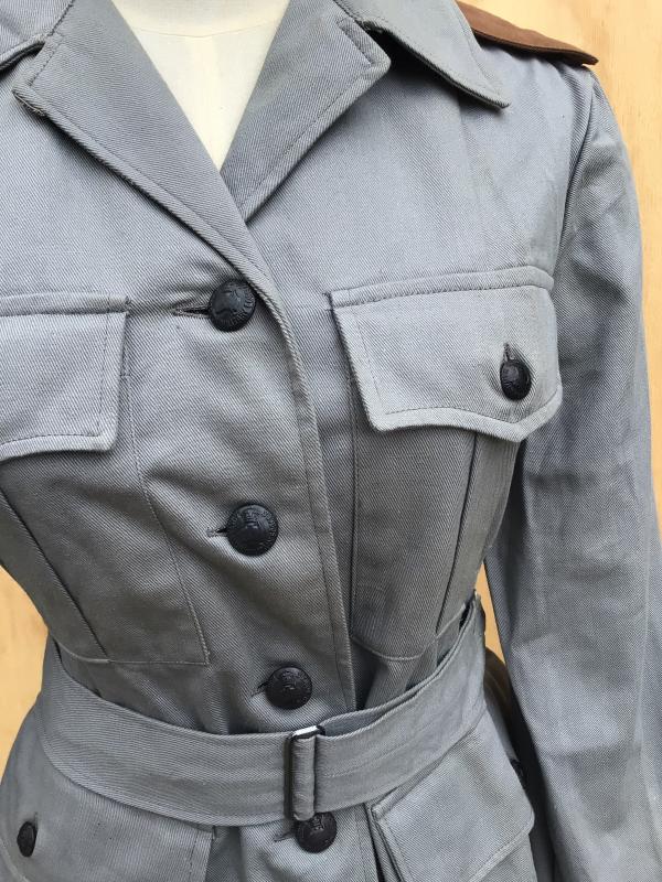 A rare example of the four pocket bush jacket. Grey cotton drill with all its oxidized AMF buttons and brown cotton drill shoulder straps. Complete with its service dress belt. Had army acceptance stampings and maker label dated 1945. Unissued condition with original paper stores tag still attached.