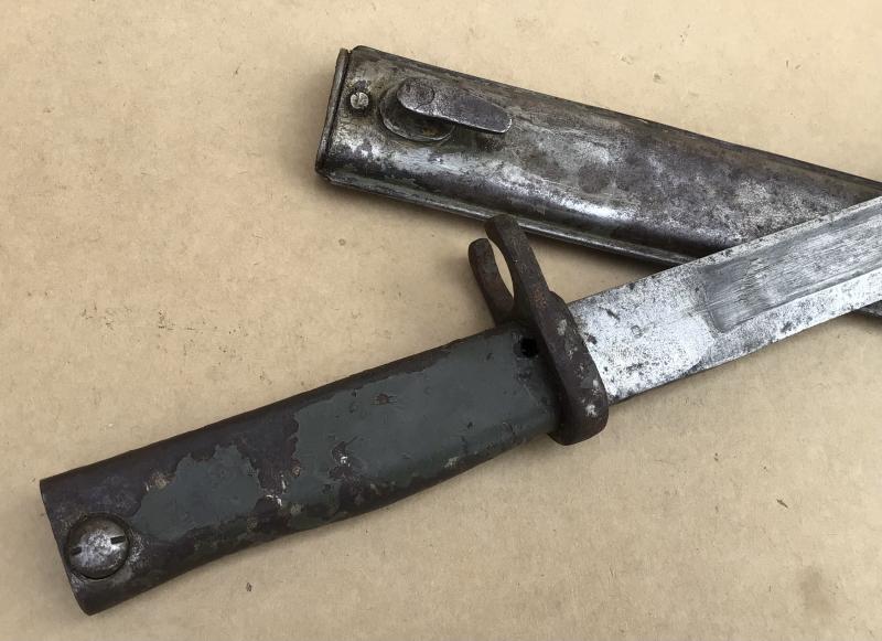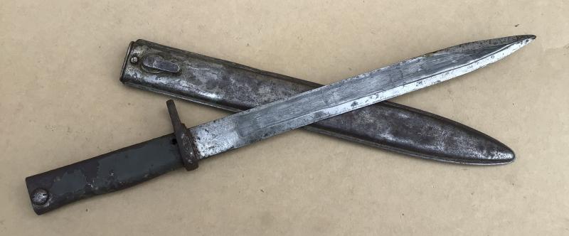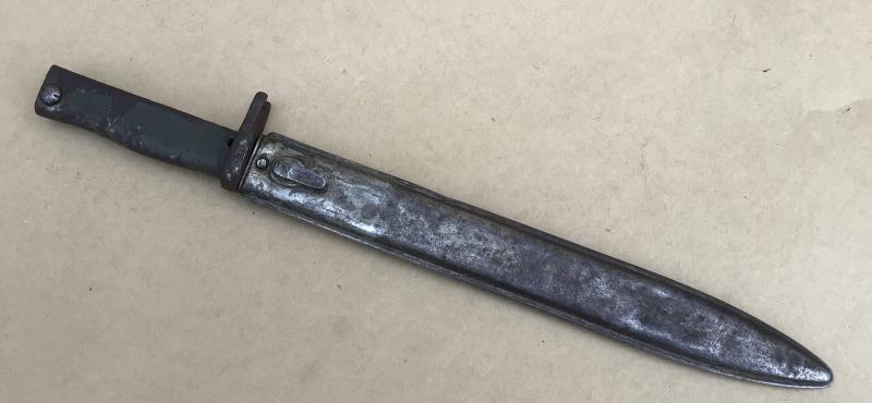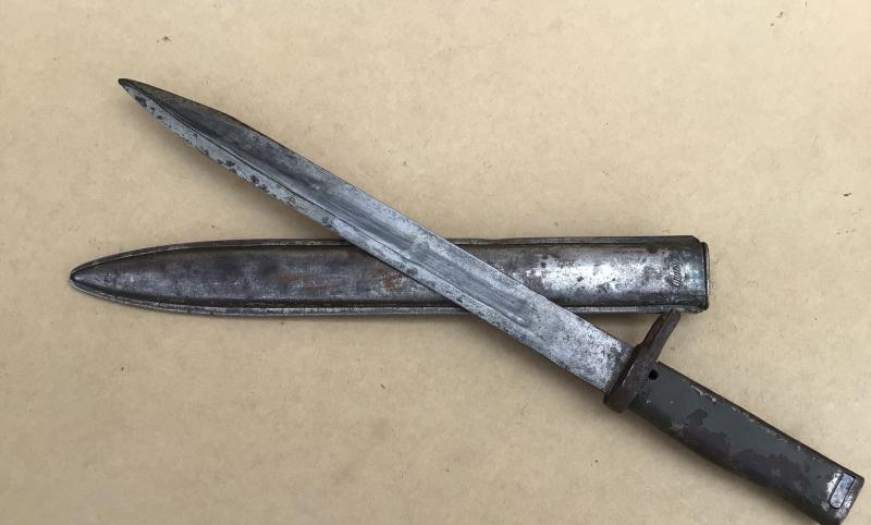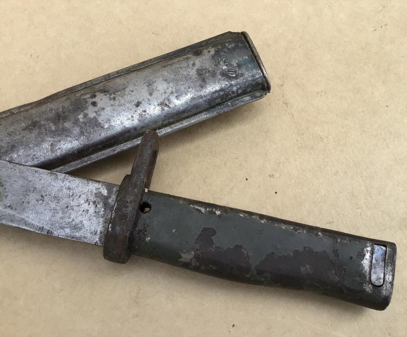 Pretty much the standard ersatz pattern. Has the ramins of the original green paint to the grips. Unfullered blade and no ordnance or date stamps Folded all steel ersatz scabbard maker marked Friedrich August Göbel.