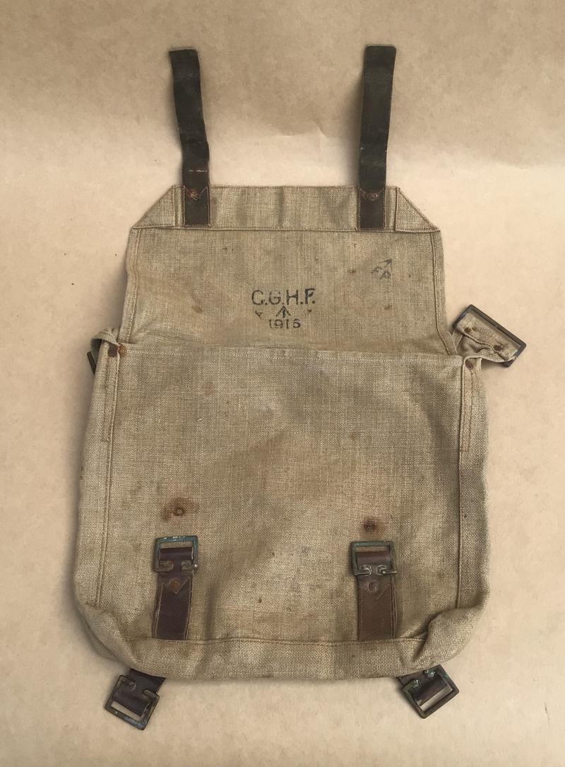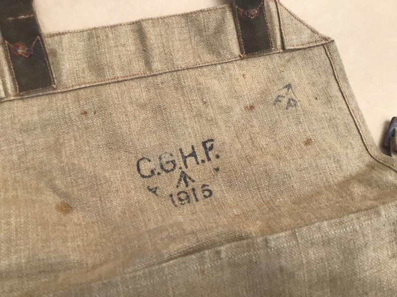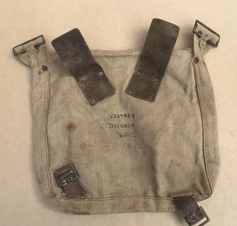 Khaki cotton canvas with all leather tabs and brass buckle clearly dated 1915 on the inside flap as well as commonwealth, government, harness factory makers, ink stamp. They’re also a handwritten militia regimental number for service during World War II.