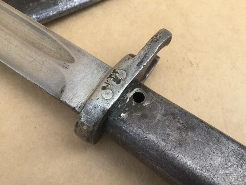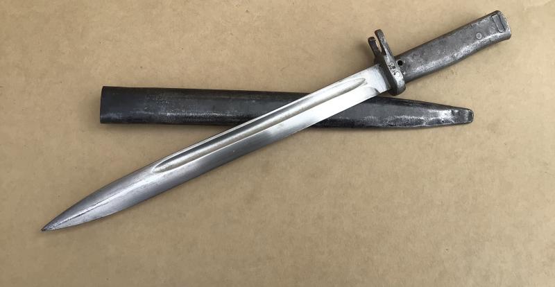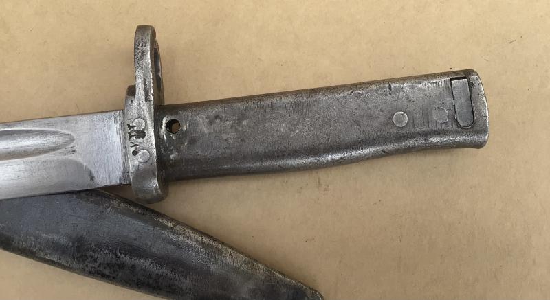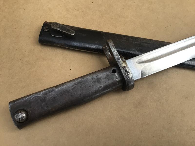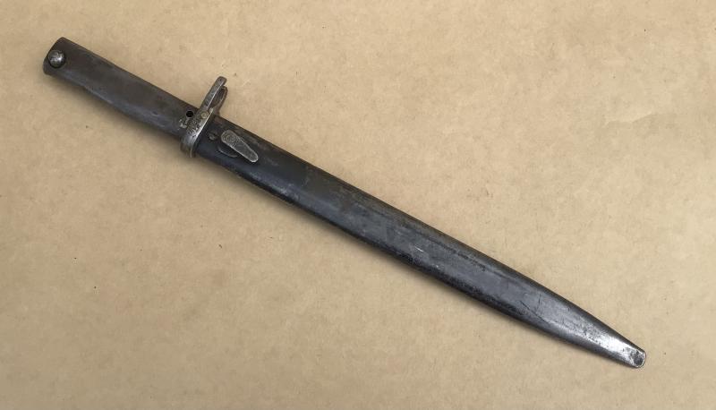 Standard all steel ersatz German made bayonet. Probably a Turkish M1935 re-issue with Turkish Arabic markings markings on the cross guard. Interesting though, no Turkish alterations cut downs to the blade. Comes with all steel matching scabbard.