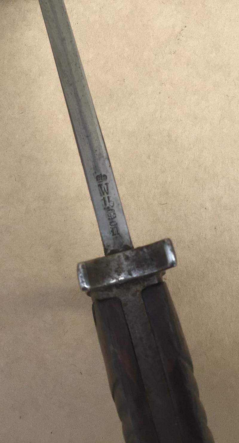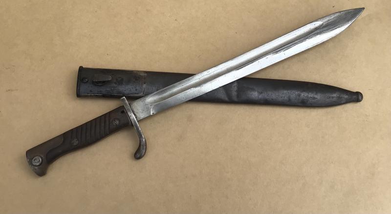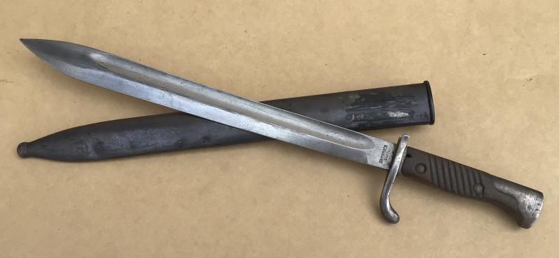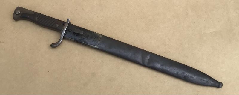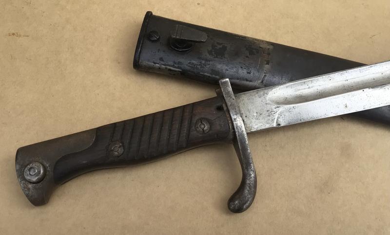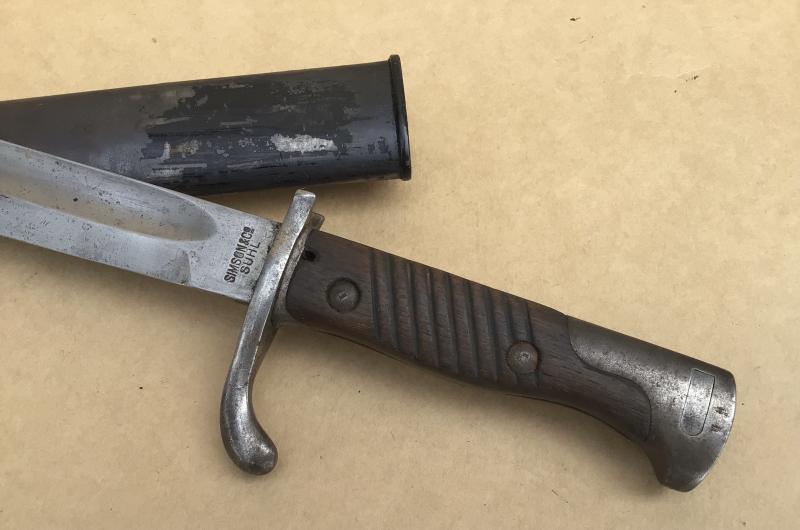 Early high muzzle “ears”. Original wooden grips and working locking stud. Comes with matching all steel scabbard that fits perfectly to the bayonet.