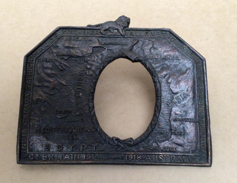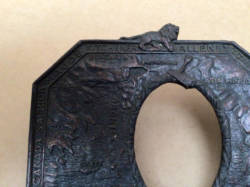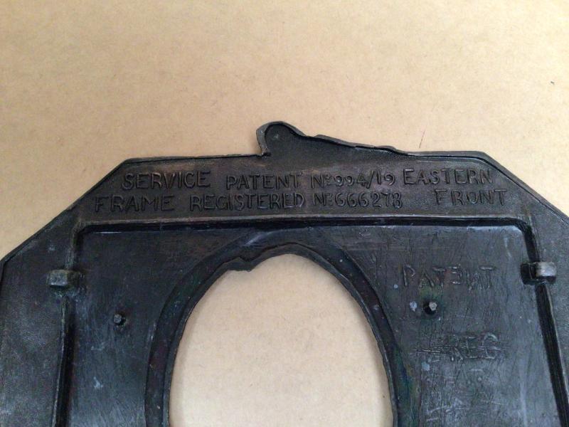 A very nice original WW1 British Eastern Front theme "Service Frame". The frame is of heavy cast shelter metal and looks to be in lovely condition with a map of the Eastern front along with aircraft and ships and also features Gallipoli and Palestine. The rear again looks good and is in nice order with nice markings and registration number, these were produced of various areas during WW1. It measures 7 inches x 7 ¼ inches. The rear would have originally have had a simple card backing to hold the photograph in place, this has long since gone but the slots/hooks to hold it are in place so a piece of card could easily be cut and used for this purpose.