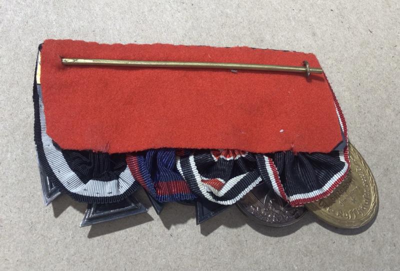 1914 Iron Cross second class, Oldenburg Frederick August cross second class with clasp “Vor Dem Feinde” (Before the enemy), The German Honour Legion medal, Kyfhauserbund Veterans 1914-18 Service Medal. All court frack mounted in reverse with pin.