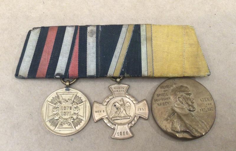 1870-71 Franco Prussian War Medal in bronze for combatants ( On the edge is inscribed AUS EROBERTEM GESCHUETZ (From conquered cannon), Prussian Koniggratz Cross 1866 and 1897 Prussian Centenary Medal .
