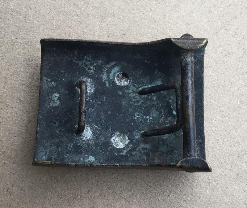 Original belt buckle still with blackened center piece. The roller on the double claw buckle on the reverse has seized.
