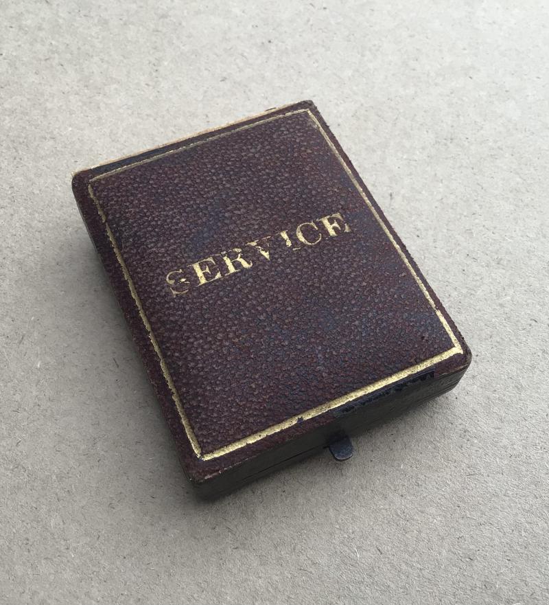 In leatherette case of issue. The case is damaged. The lid is detached. The top edge of the bottom of the case along the hinge has broken off. This could be repaired with glue and some spare time.