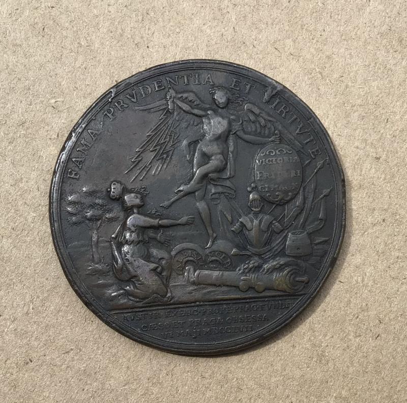 Awarded during the Seven Years War Frederick II was victorious against the Austrian army at the Battle of Prague on 6 May 1757, but his losses were so great he was unable to take the city, and settled for besieging it. On 18 June 1757, Frederick suffered his first major defeat at the Battle of Kolín, which forced him to abandon his invasion of Bohemia.