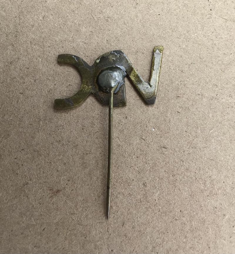A hand crafted badge. Hand cut from shell brass with a crudely affixed stick pin. Approximately 30mm x 50mm.