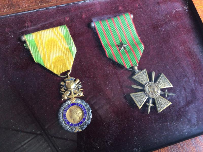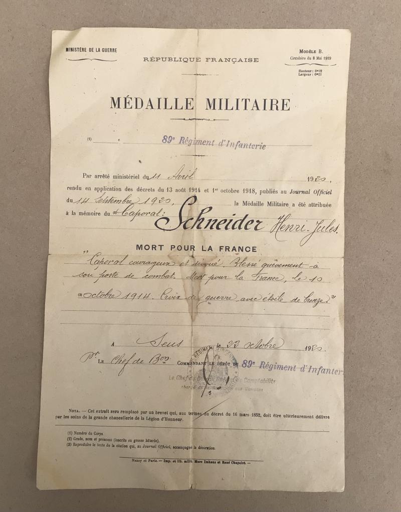 An attributed pair, Médaille militaire And Criox De Guerre. Nicely presented in an old wooden framed glazed frame approximately 180 x 270mm. Together with a posthumous award certificate dated April 1920 awarded to Cpl Henri Schneider of the 89th Infantry Regiment. Certificate 210mm x 320mm.