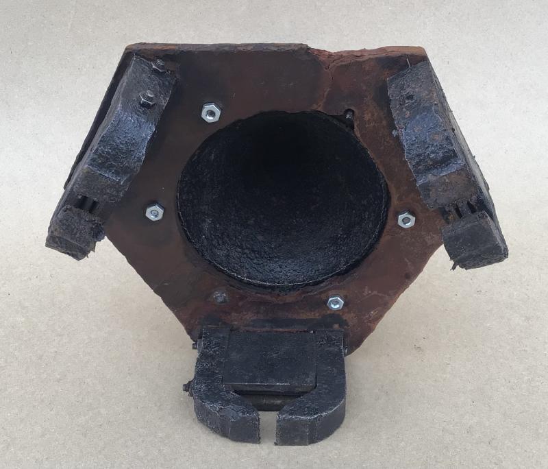 A rare original anti-tank 3kg shape charge. The bottom screws securing the original pasteboard are modern replacements. No top cap or igniter fuse. Some overall pitting. The magnets still with some magnification.