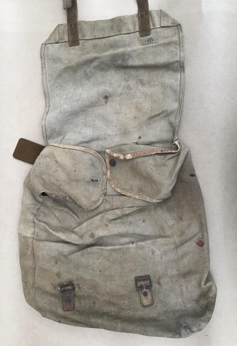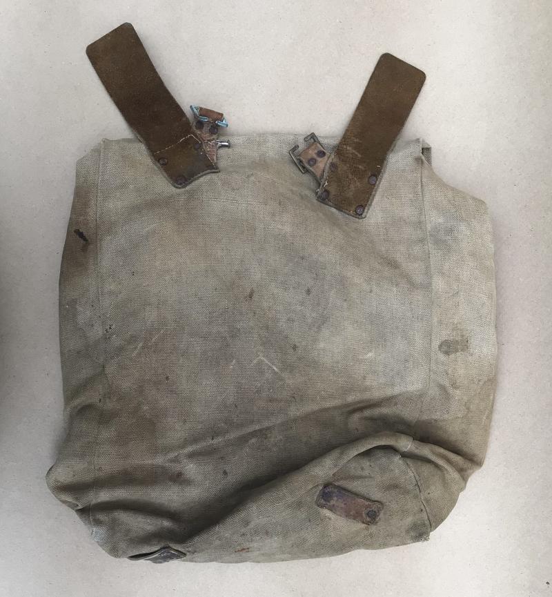 Khaki duck canvas with leather straps and buckles tabs. A well worn example with overall heavy soiling and a damaged rear shoulder strap attachment tabs. One tab is secure but has a rivet pulled out from the auxiliary strap buckle, this still holding on firmly. On the other tab one rivet is missing but the other three are holding firm. To the interior of the flap can be seen some hand written initials along with the faint remains of the “CGHF” stamp , the ordnance acceptance stamp and the date, either 1916 or 1918.